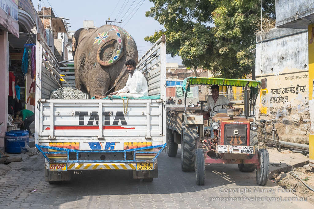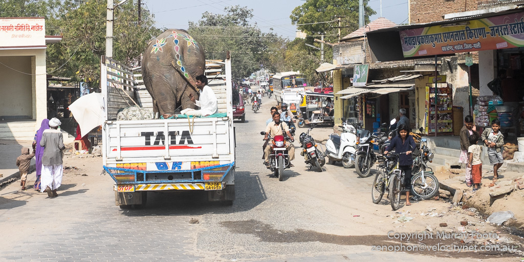 This morning we piled into the bus for a journey to Manvar Desert Camp. Before too long we had come up behind an elephant, though it was riding in the back of the truck.