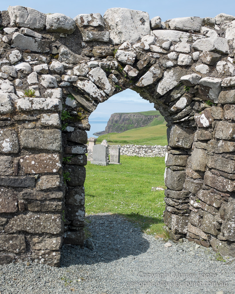 I could have photographed her memorial stone in Trumpan had I known of it at the time and I almost did – it is the white stone just peeking out beyond the right hand side of the archway. The actual location of her grave is not known. There are a couple more images of the ruined church in the blog post.