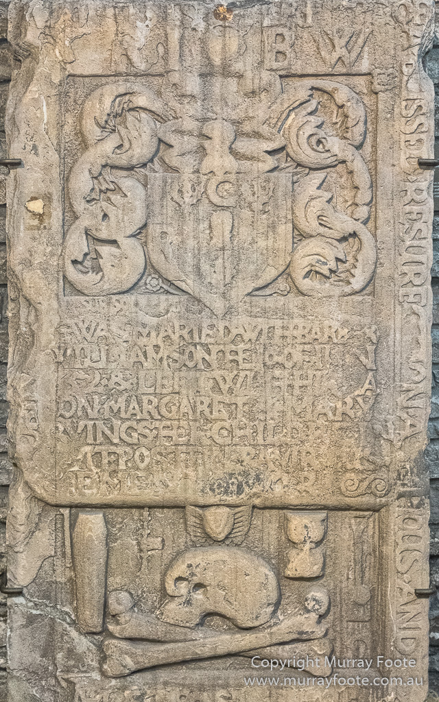 Inside the walls of the cathedral, through the arches, is a remarkable series of memorial plaques.  I hope the formatting works for you.  They were originally on the floor of the Cathedral, which may account for why some are quite worn.