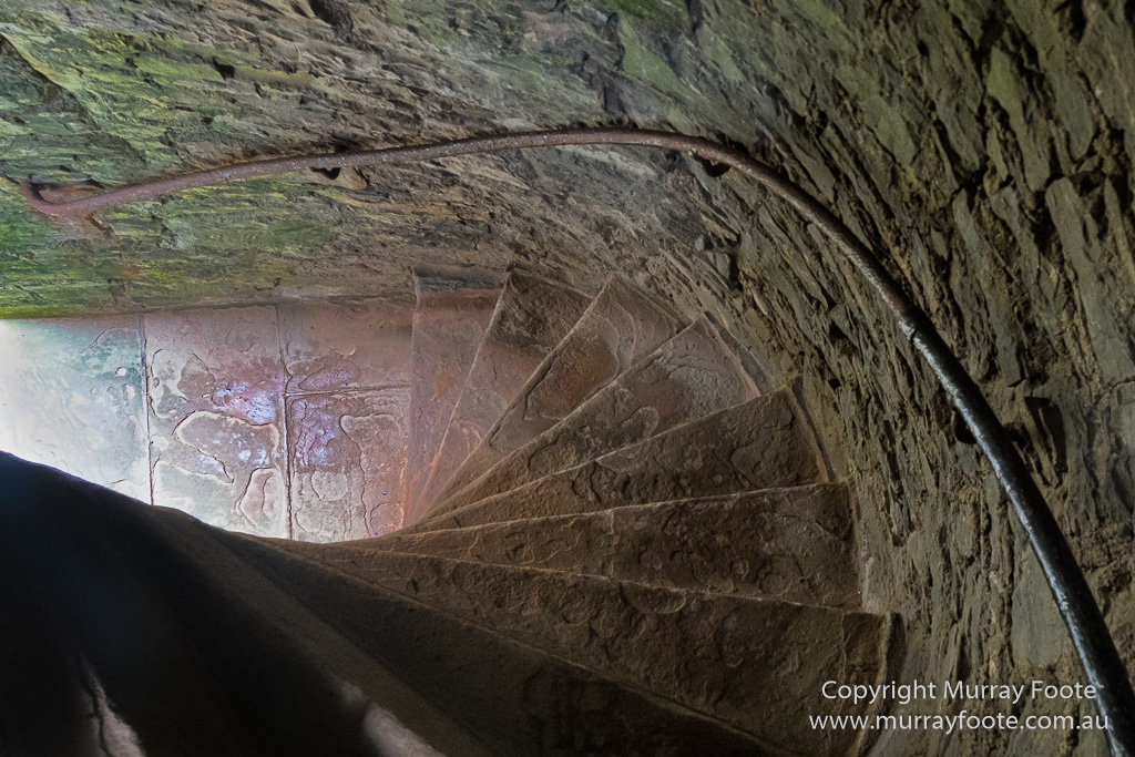 Looking down a castle stairwell.