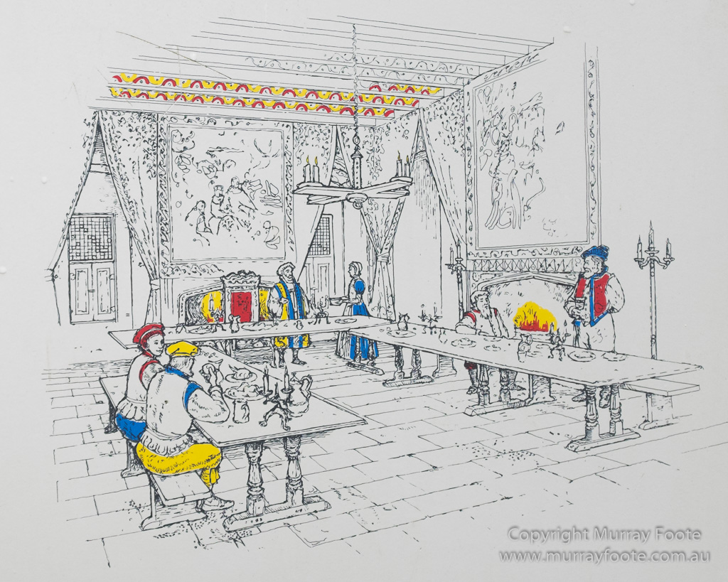 This is how the Main Hall may have looked at the time, from an information board at the site. The walls were plastered and hung with tapestries. There were also many large open fires to maintain warmth, extravagant no doubt in a land with little or no wood unless they used turf, dung or peat.