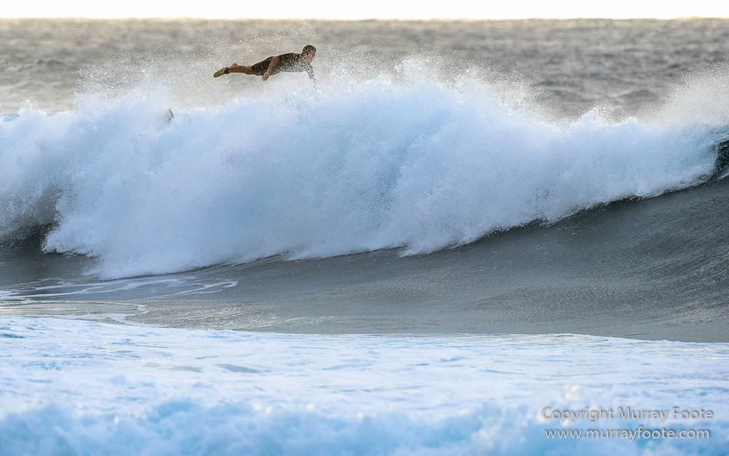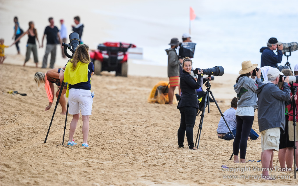This gives a hint of some of the equipment we used to take photographs. Robyn (facing camera) has a 400mm lens and is using an ordinary ball head on her tripod. The woman on the left (Lisa?) and the man at far top right (not in our group) are using gimbal heads instead of a ball head. This lets the lens balance on the tripod and allows for quicker changes of direction to follow the movements of the surfers. The woman with that hat and a towel over the lens (Kim?) has a 600mm lens. I had hired a 600mm lens and a Wimberly Gimbal Head and was using a Nikon D3s as my main camera.