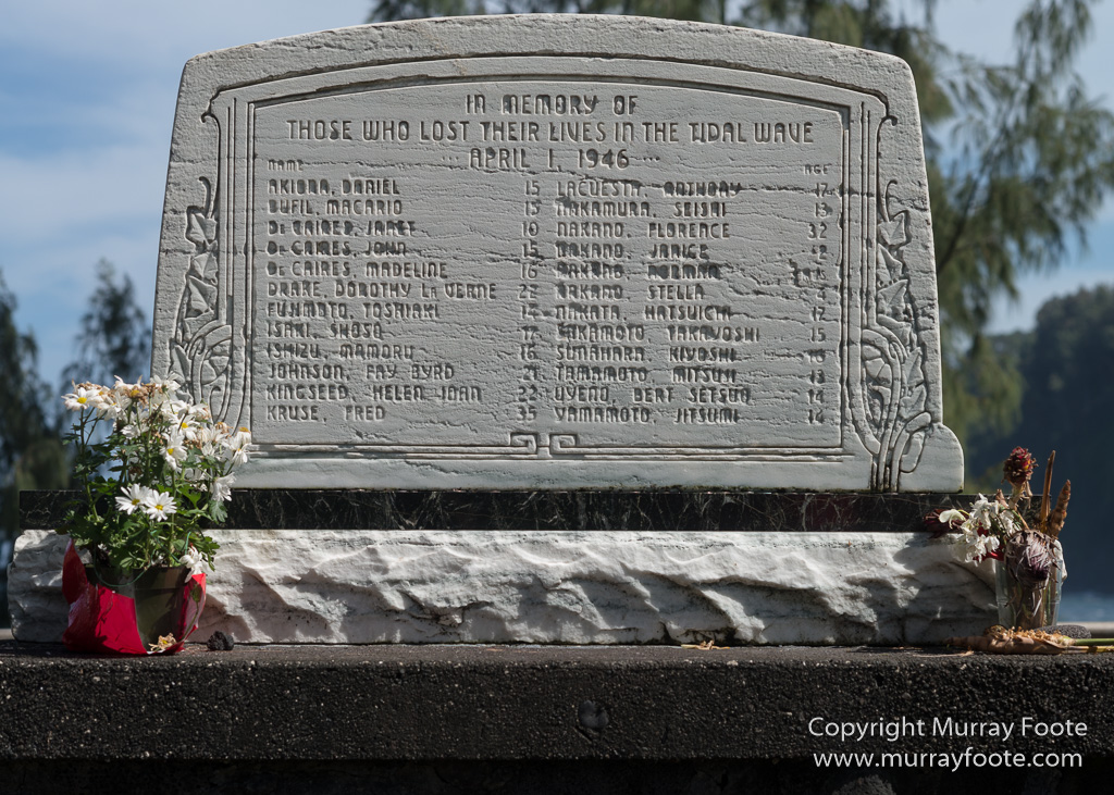 Damaging tsunami have hit Hawaii in 1837, 1841, 1868, 1868, 1869, 1872, 1877, 1883, 1906, 1918, 1923, 1933, 1946, 1957, 1960 and 1975. Laupahoehoe was inundated by one in 1946 that originated in the Aleutian Islands. 159 people died, mainly in Hilo but including 23 children and 4 teachers in Laupahoehoe. There were three waves and the children were on the beach collecting fish left by the second wave when the third and largest wave hit, thirty metres high. Only one teacher and two children survived. This is near where the school was, close to the sea. Residences and school buildings are now further from the sea.