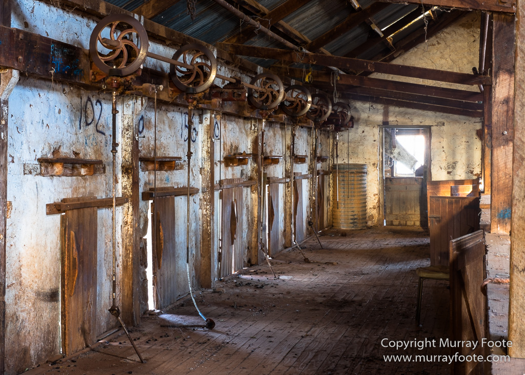 After dawn, we visited the old woolshed. Probably obviously enough, this is where the shearing was done and the shorn sheep were dispatched outside through the sliding metal doors on the left wall.