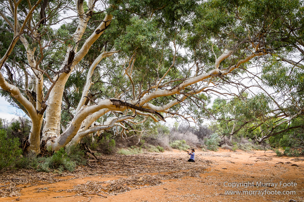 The Oonartra River was dry, as is usually the case, though historic photos with boats show that this may once have been different. Magnificent river gums line the bank of the dry river.