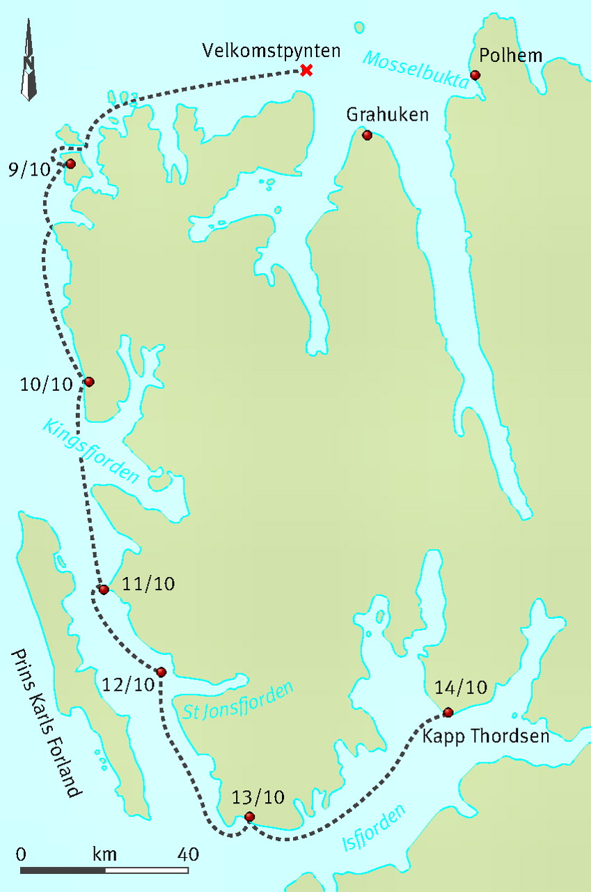 Six sealing vessels with 59 men were trapped by the ice north of Spitsbergen near Grahuken with winter approaching and little food. Swedish explorer Adolf Nordenskiöld happened to be nearby setting up winter quarters at Polhem. Seven sealers crossed 50 kilometres of ice to ask him for assistance. He was able to provide some but advised making for the Swedish House at Kapp Thorsen which was well supplied with canned food. Seventeen of the sealers rowed 350 kilometres in seven days to get there. Meanwhile, two weeks later, there was a break in the ice and the remaining sealers were able to escape in two ships.