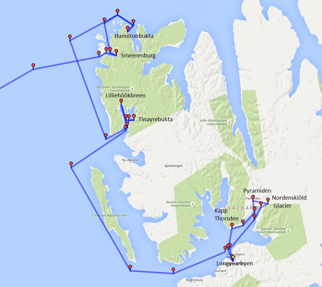 This is the voyage. Up the coast of Spitsbergen, across to Greenland, down the coast of Greenland through the fjords and then down to Iceland. The red dots don’t all indicate stops. Many are intermediate points to simulate the route. There is also serious distortion here due to the Mercator projection. Spitsbergen (or Svalbard to use the less ambiguous name) is actually half the size of Iceland.