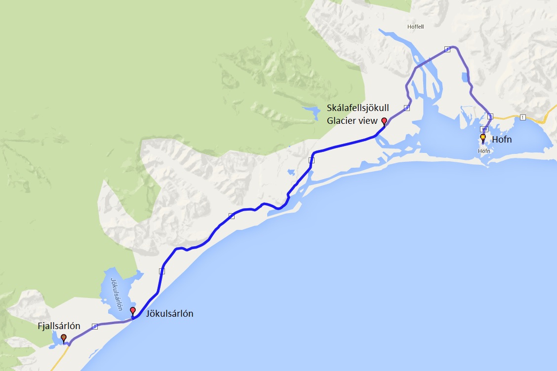 On this day I travelled from Hofn to Jökulsárlón. For dawn on the day after the next I went to Fjallsárlón which I also show on the map here.
