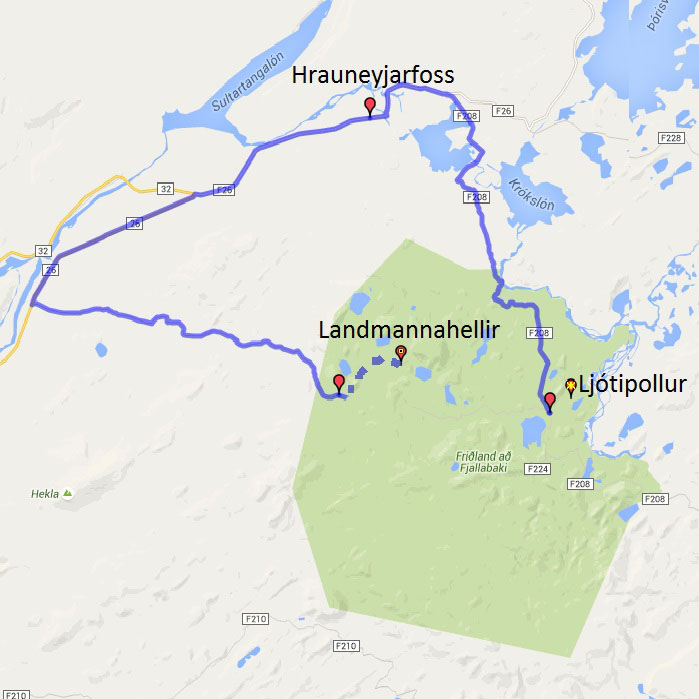 The last two posts were at Ljótipullur.  I drove to Hrauneyfoss which is an hotel, a little island of civilisation in the wilderness.  I needed to fill up with petrol and also took the opportunity to have a meal in the restaurant.  Then I proceeded back along the F26 until making a sharp left onto Landmannaleið (or F225).  I stopped at Landmannahellir for the night.  The dotted line at the end roughly represents an alternative road that is not covered by the mapping utility I am using here.  The next day I would end up back at Landmannalaugar.