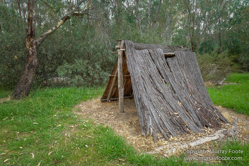 Aboriginal bark hut in simulated Wiradjuri campsite.