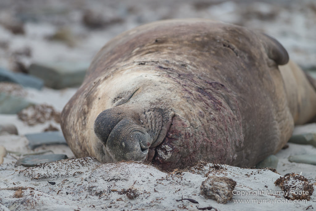 Peacefully sleeping on the beach. Note the traces of blood though on the neck. There have been some territorial contests going on.