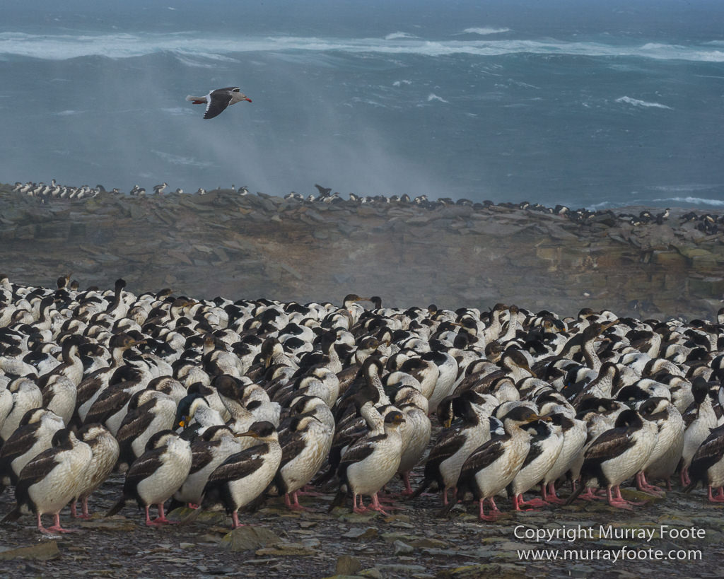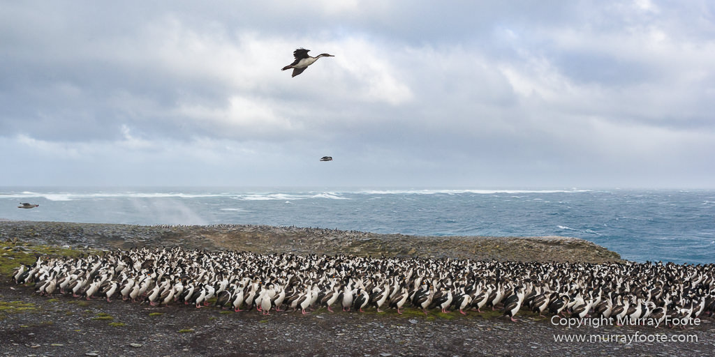 The birds in the sky are a mixture of the more drab juvenile King Cormorants and adults in their magnificent finery.