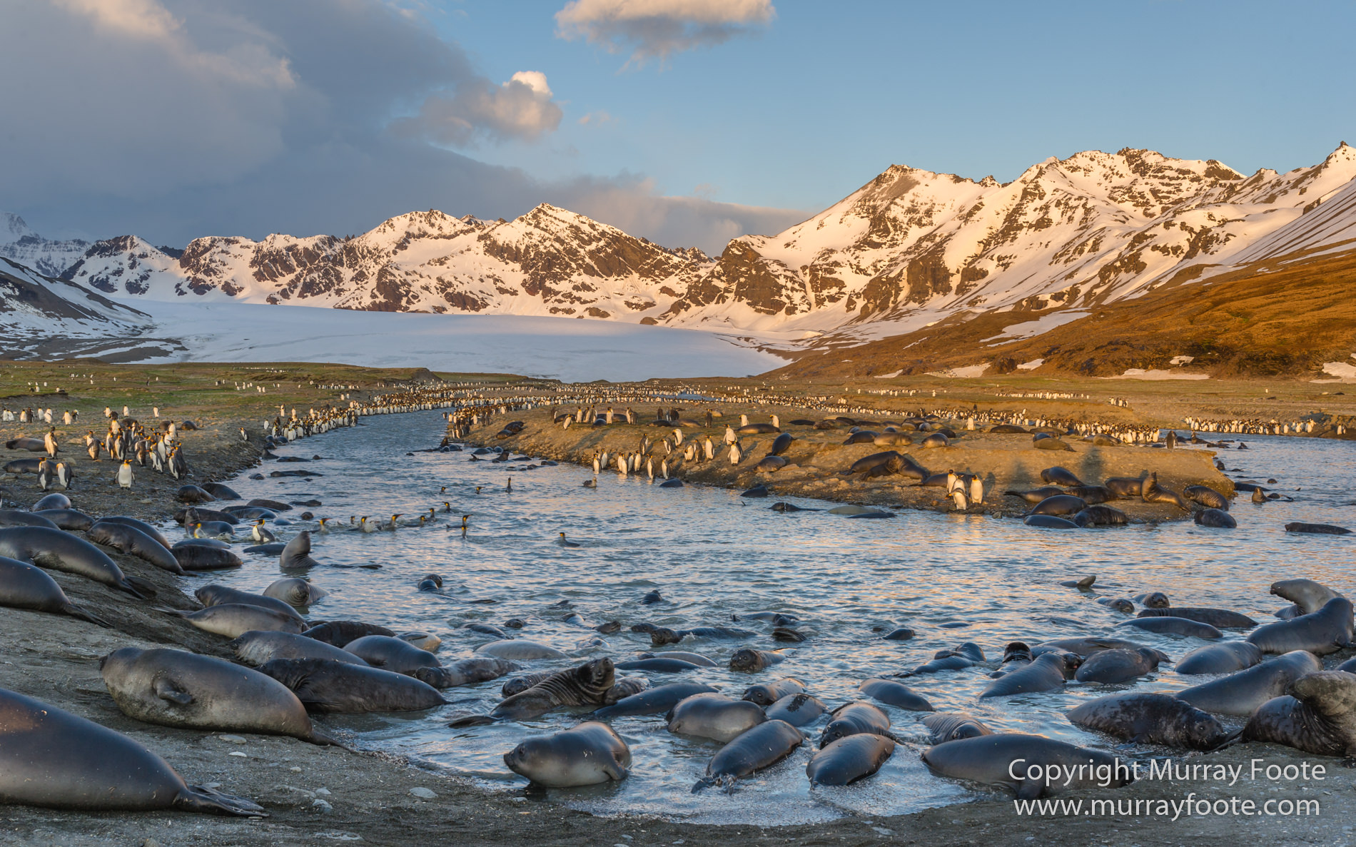 Vista up the river. Elephant seals in the foreground, king penguins along the river, glacier in the distance.