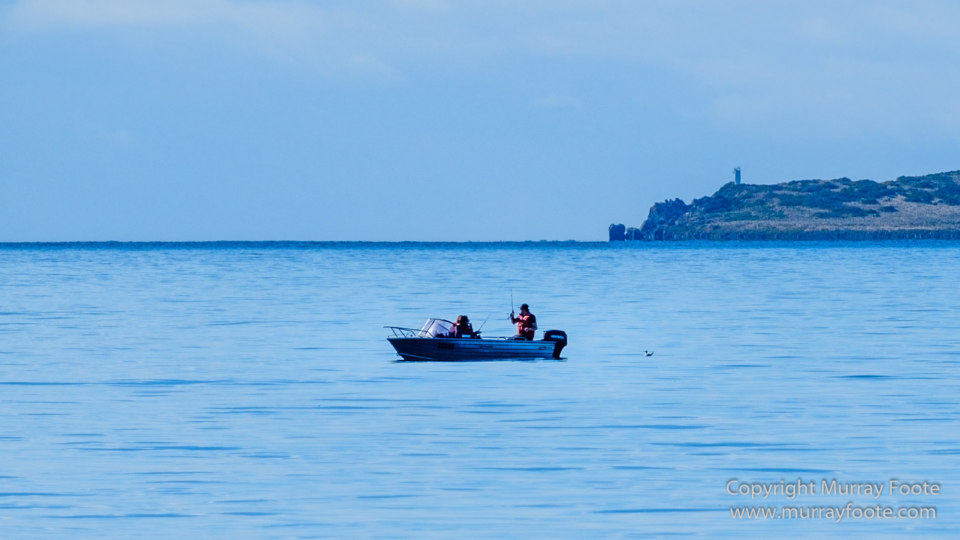 Some fishermen on the calm sea. The northern point of Maria Island in the background. A seabird waiting behind the boat.