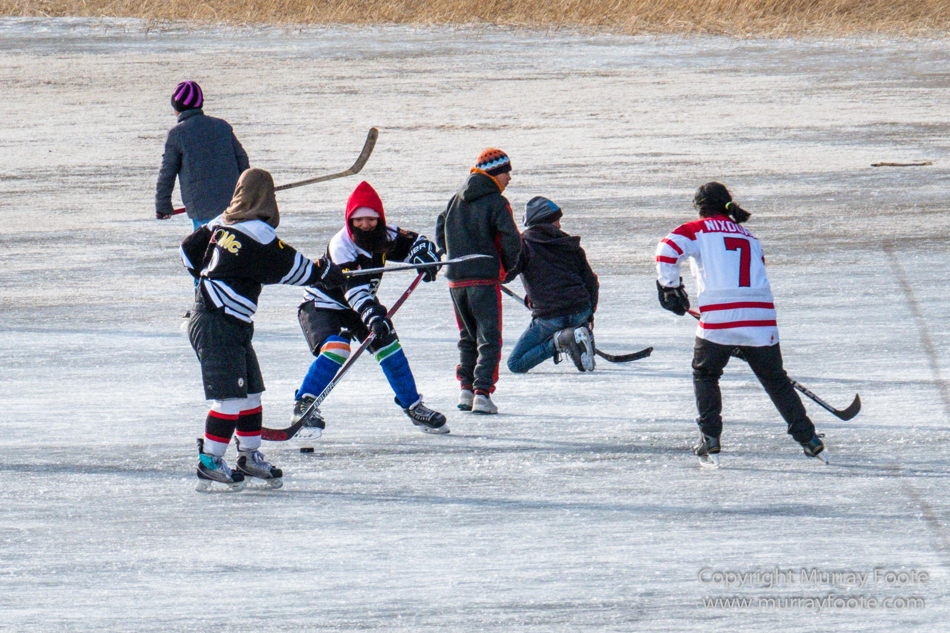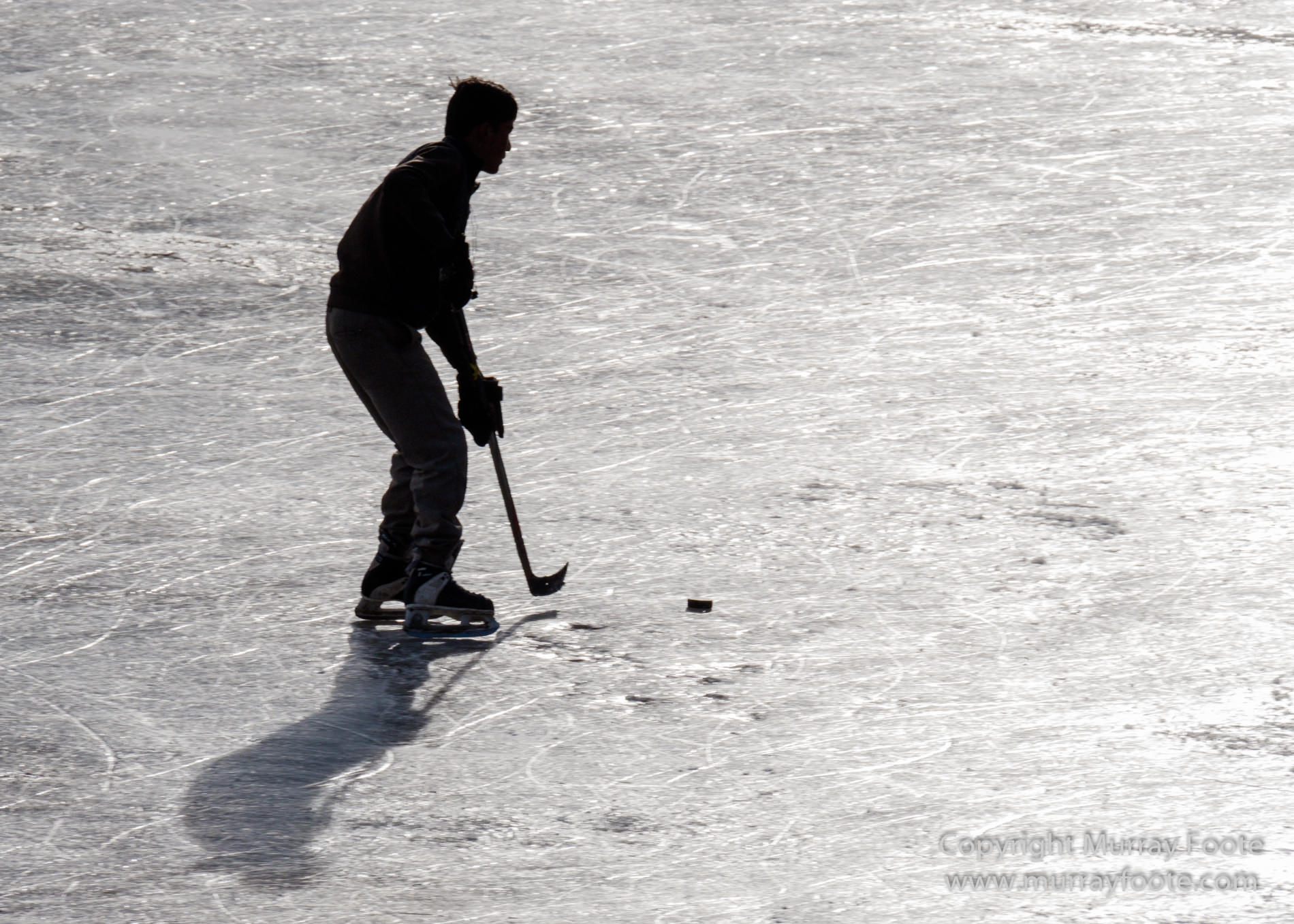 Further on, many locals, probably families from a military base, are playing ice hockey on a frozen river.