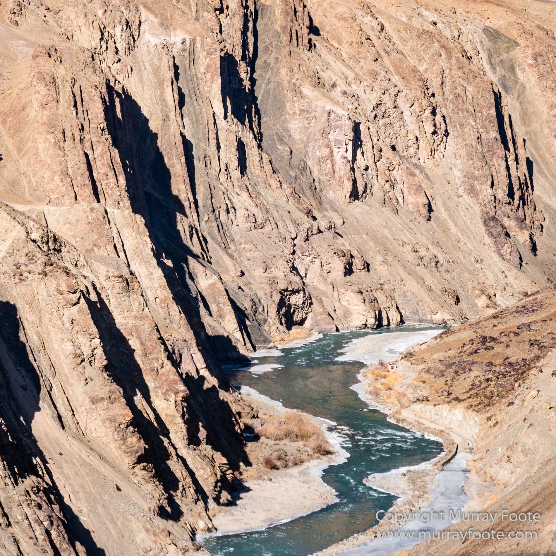 Down below in the Indus River, a bank of ice has formed around a gravel bar.