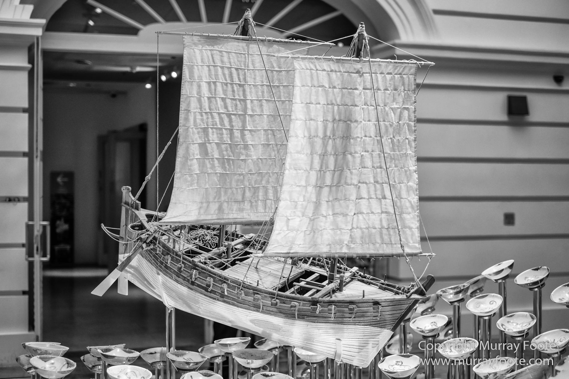 Model of ninth-century ship and bowls retrieved from wreck.