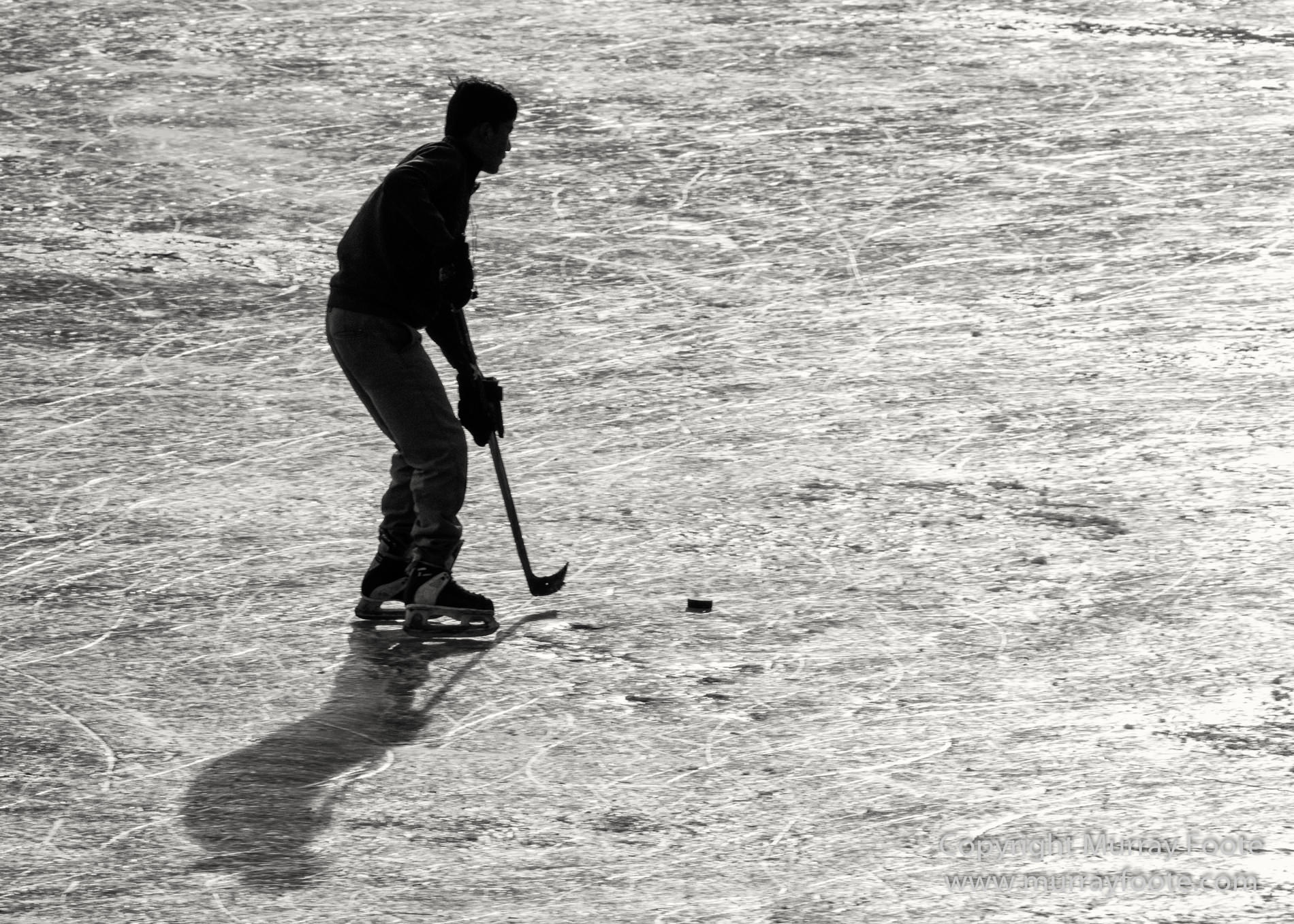 Hockey on the ice by families outside a military camp.