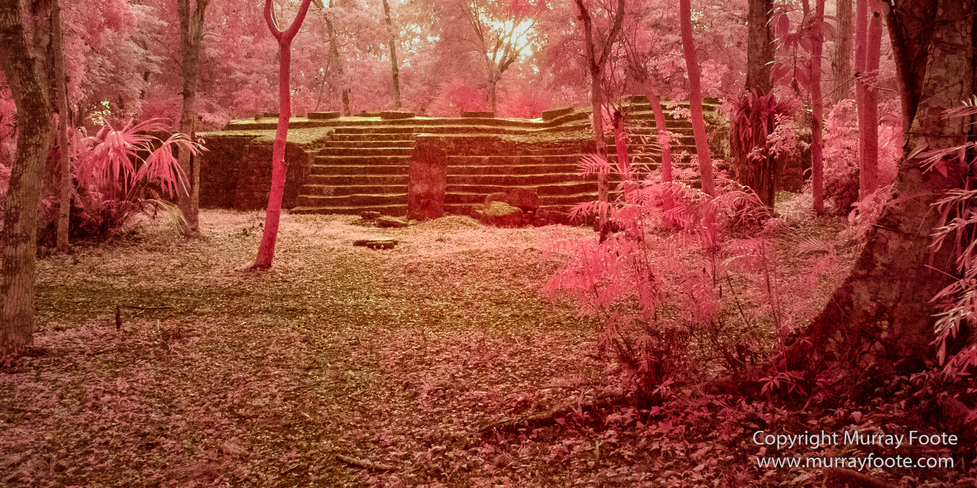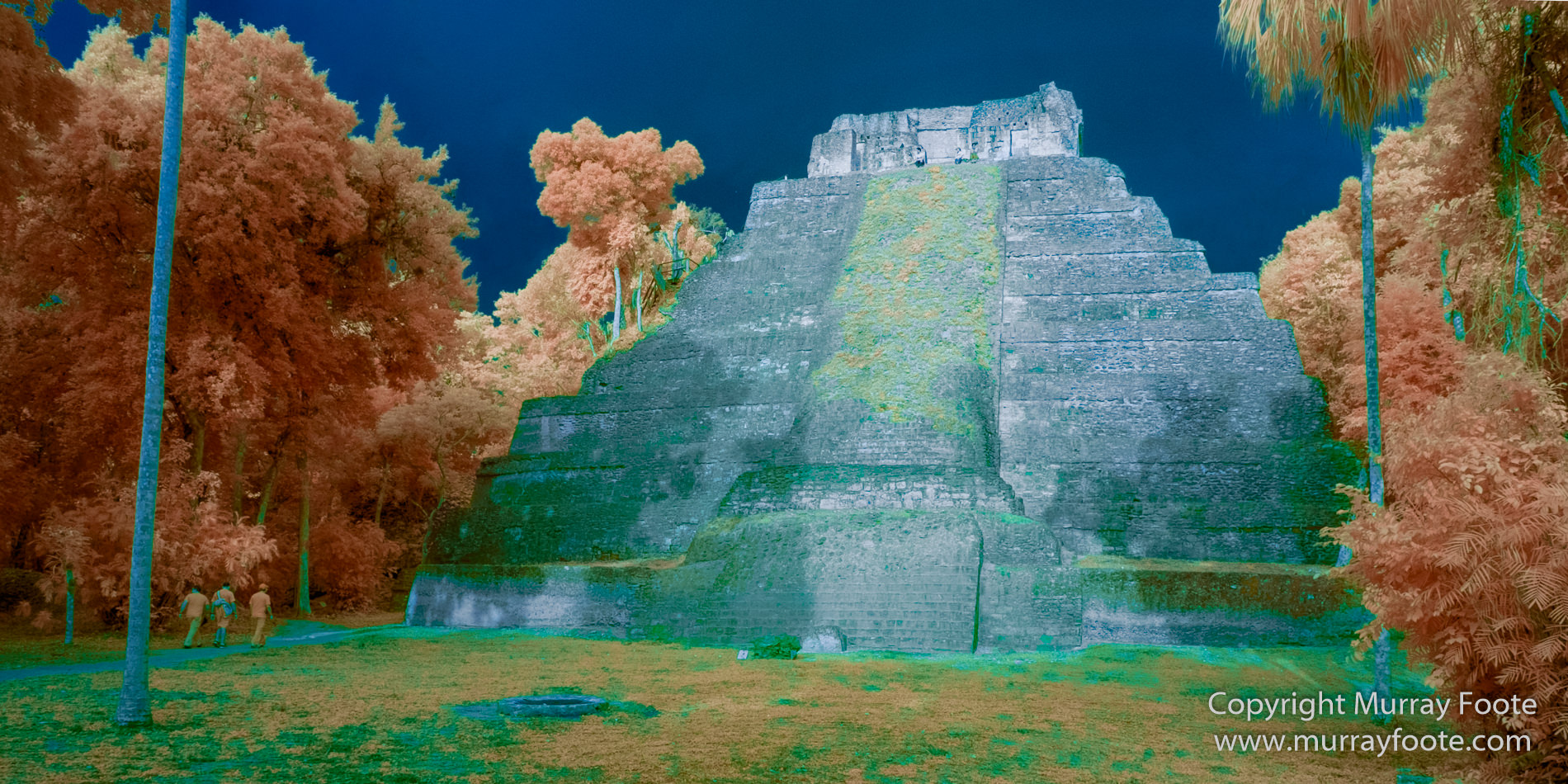 This image is intended to provide a hint of realism, albeit in infrared. The pyramids would have been painted and I have a book which shows the Yaxha pyramids as red. Perhaps that’s accurate because the main noticeboard at the site also shows them as red. There would have been no trees around though and no grass growing on the steps. The whole surrounding area would also have been paved and, if the illustrations I have seen are accurate, white.