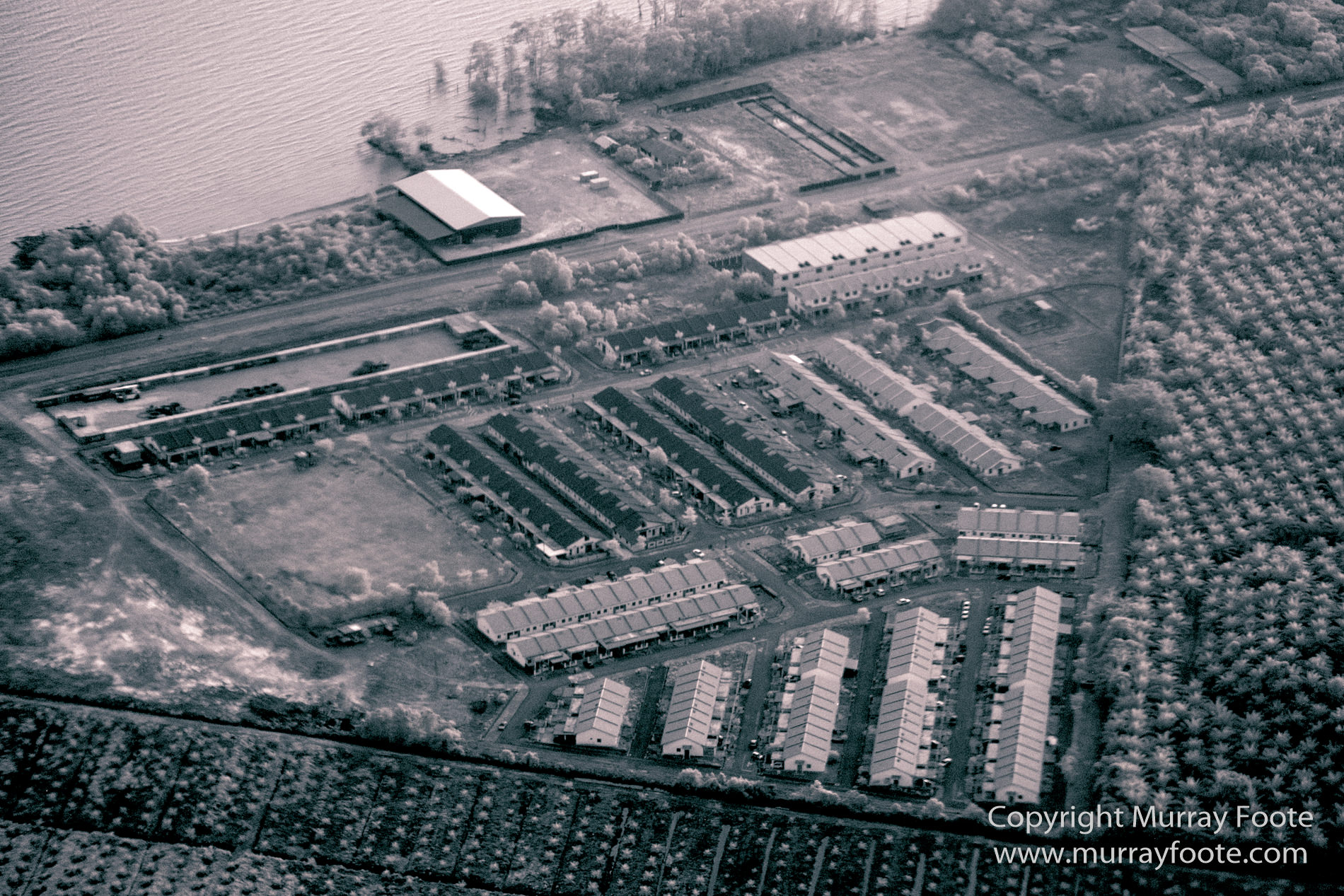 Workers’ cottages, probably, beside the ubiquitous palm oil plantations.