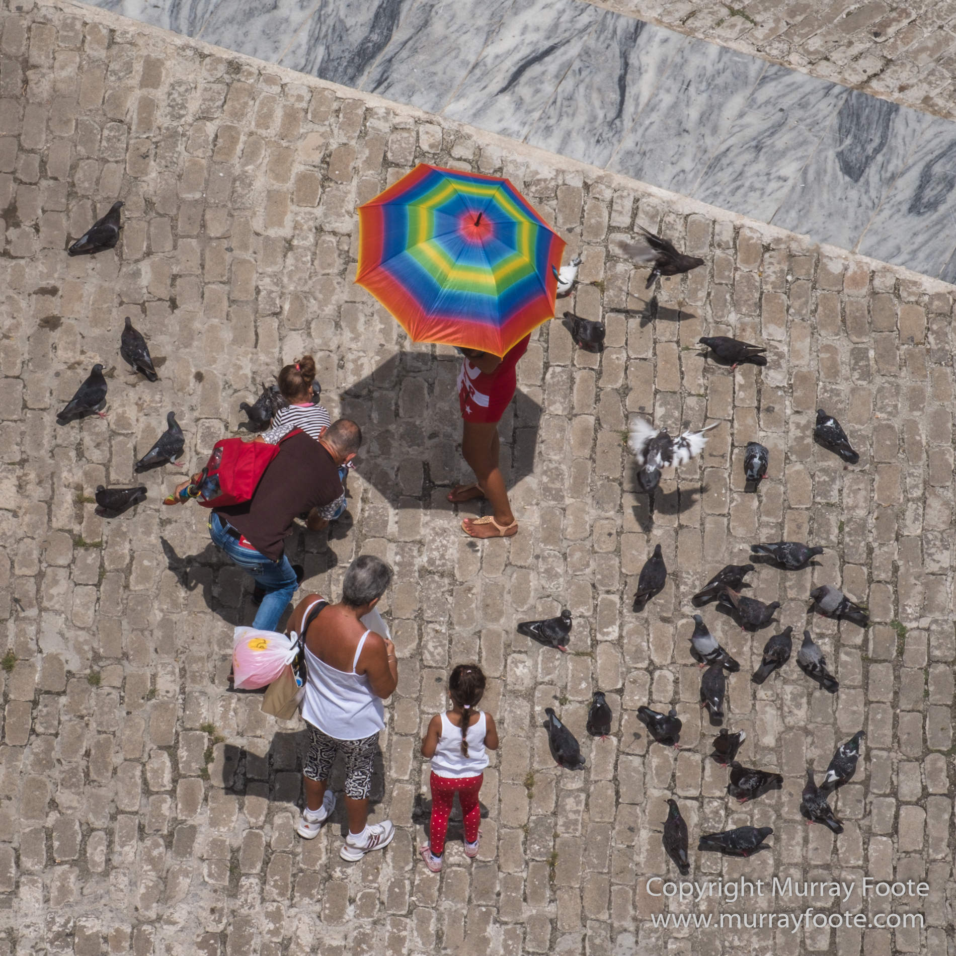 People and pigeons in the street below.
