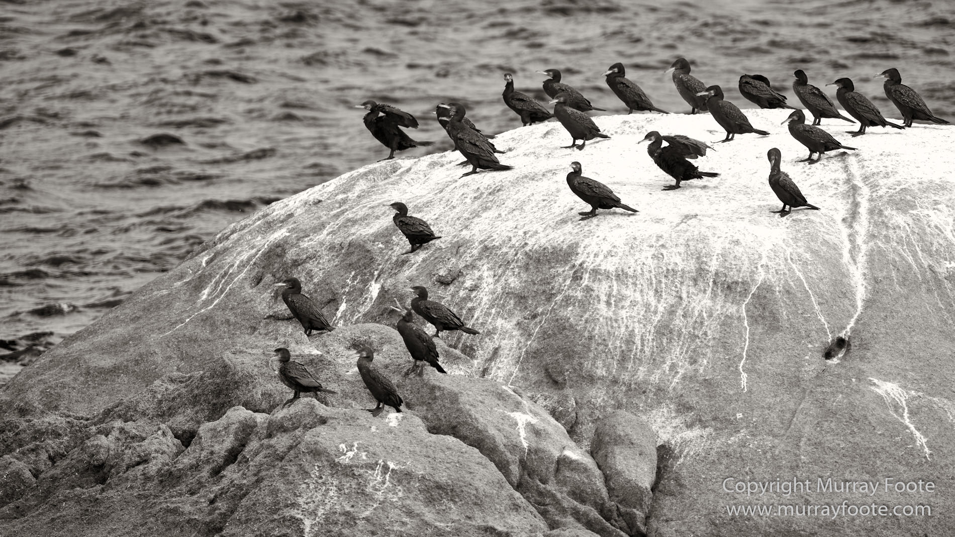 Great cormorants on rock.