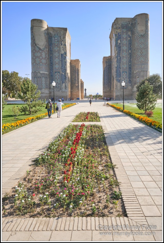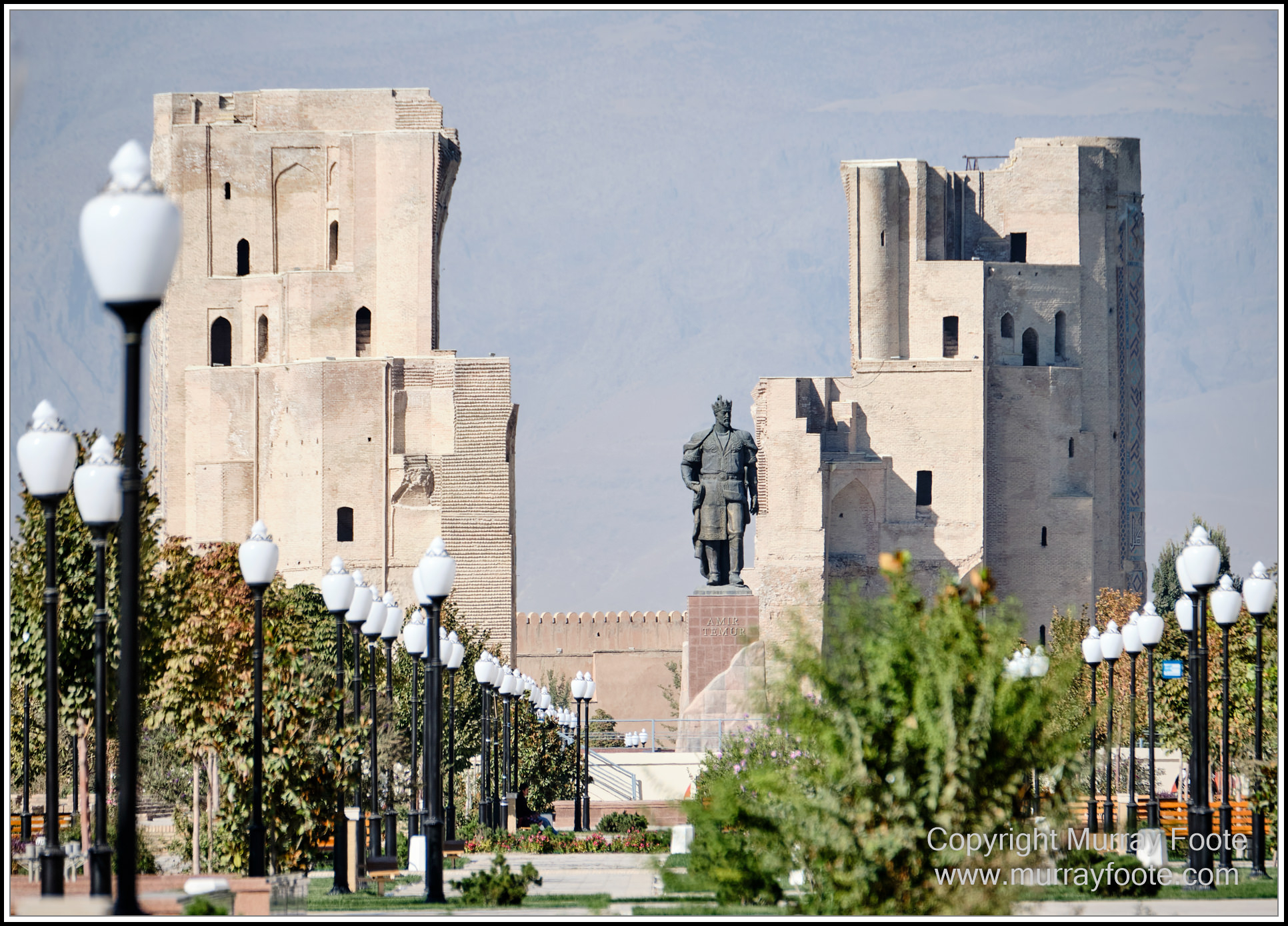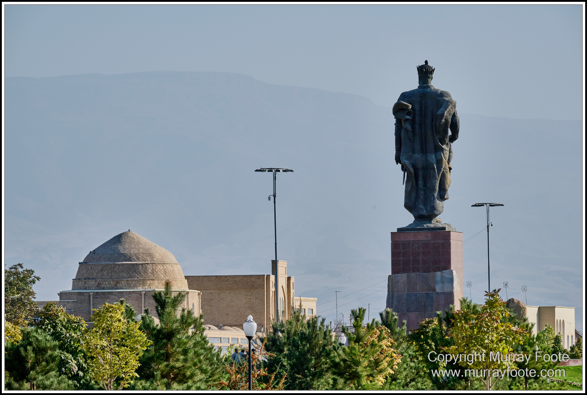 I used a very long telephoto, the full-frame equivalent of 525mm and also cropped a little.  Perspective compression means Timur’s statue appears much closer to the background structures than it really is.  The city wall is also further away from the remains of the arch than it seems.