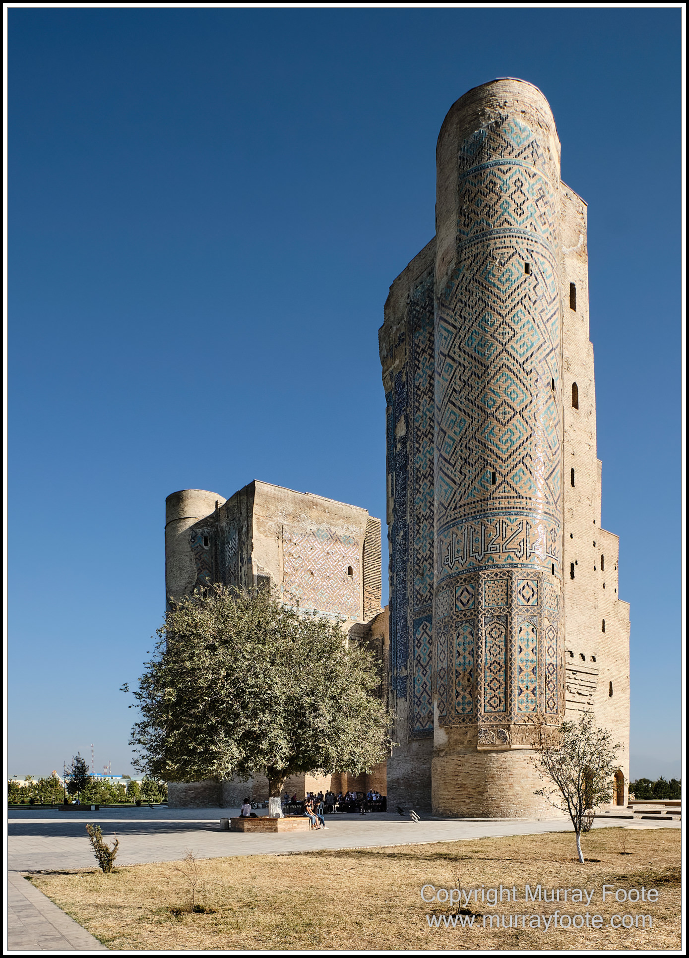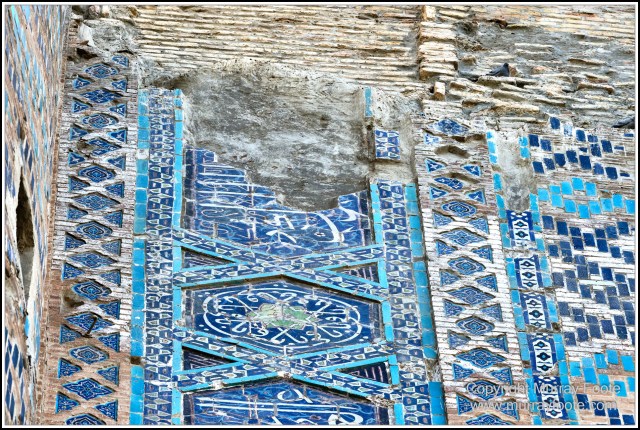 The space between the two pillars looks wide and open, for anyone to walk through, but that’s not how it would have been.  Obviously, it would have been possible to restrict entry though events on a massive scale would also have occurred.  There was a wall around the palace as well as another around the city, and there would have been a gate under the arch and much of that space would have been enclosed.  Apart from what remains, the palace was destroyed by Abdullah Khan, ruler of Bukhara, at the end of the sixteenth century.