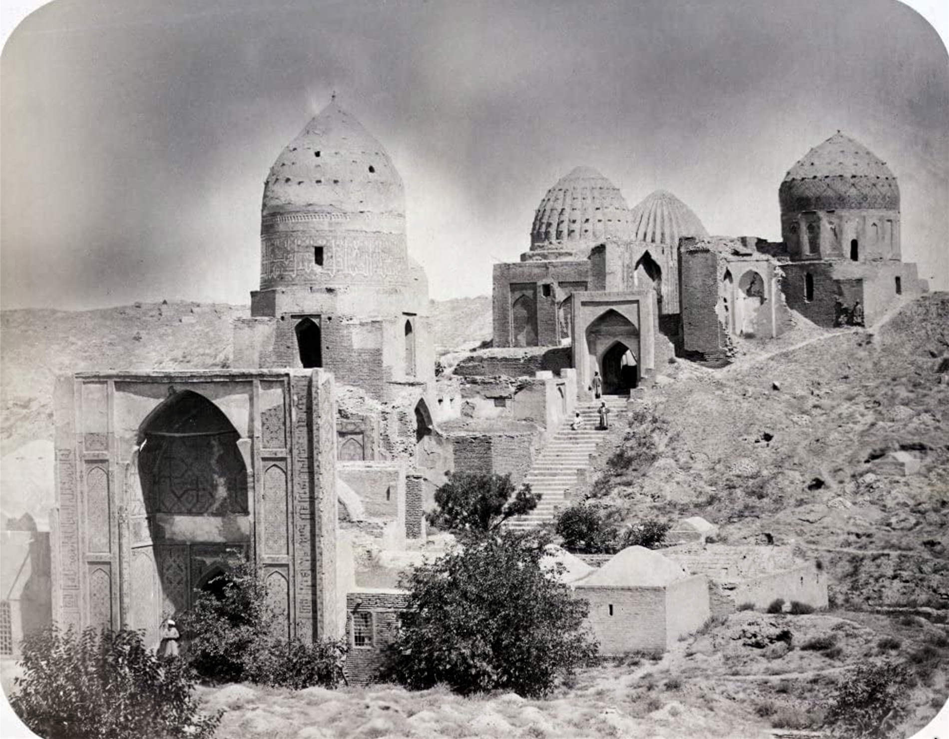 The Shadi Mulk Adi Mausoleum is on the left, where the woman is leaning against a wall, probably taking a photograph on her phone of the Uzbek couple opposite.