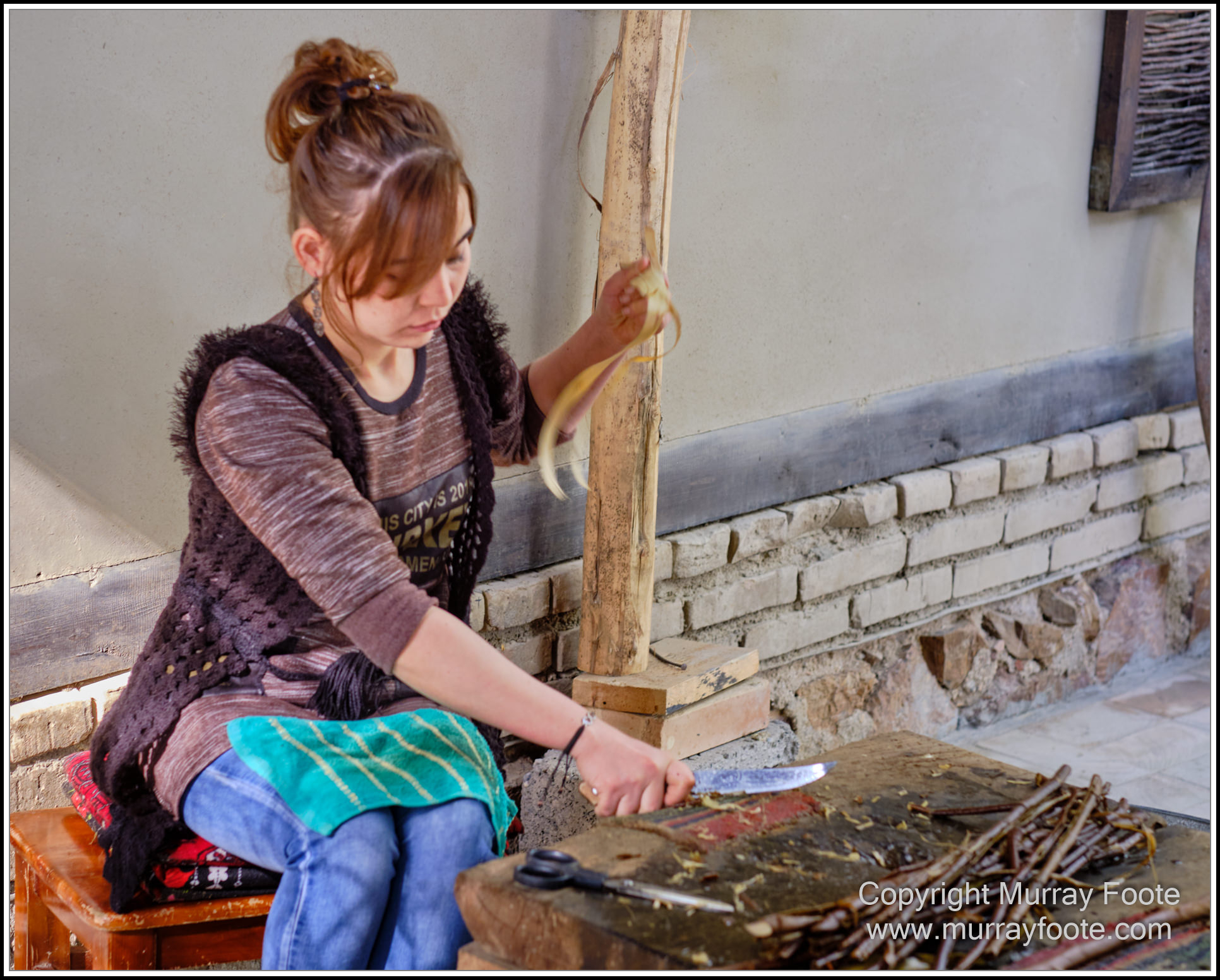 Young woman extracting strips of bark from branches of young mulberry trees.