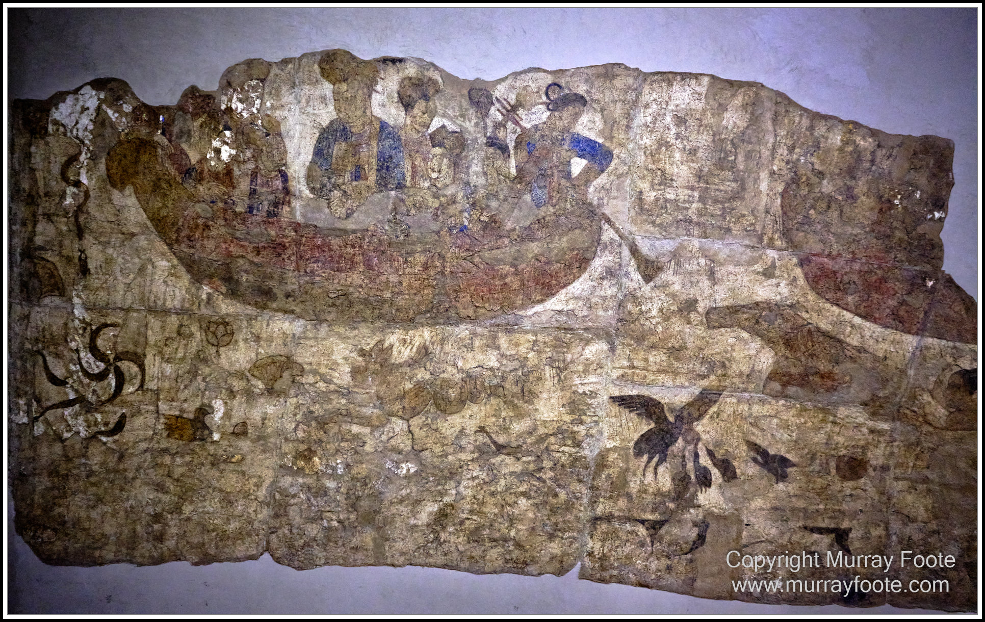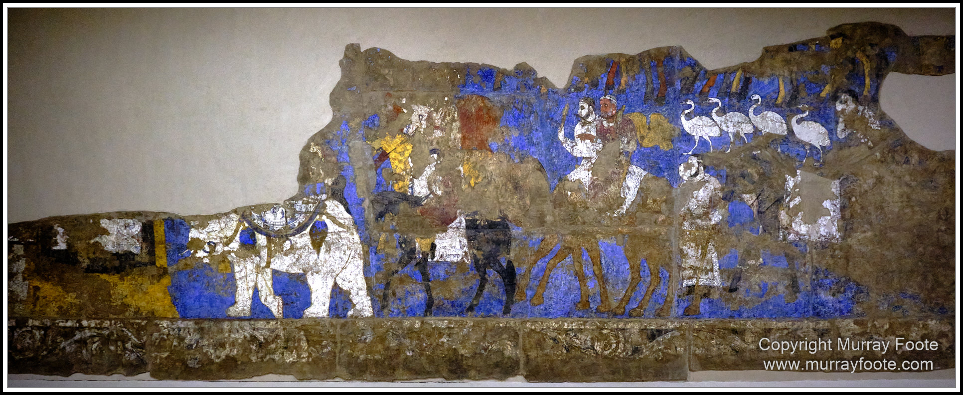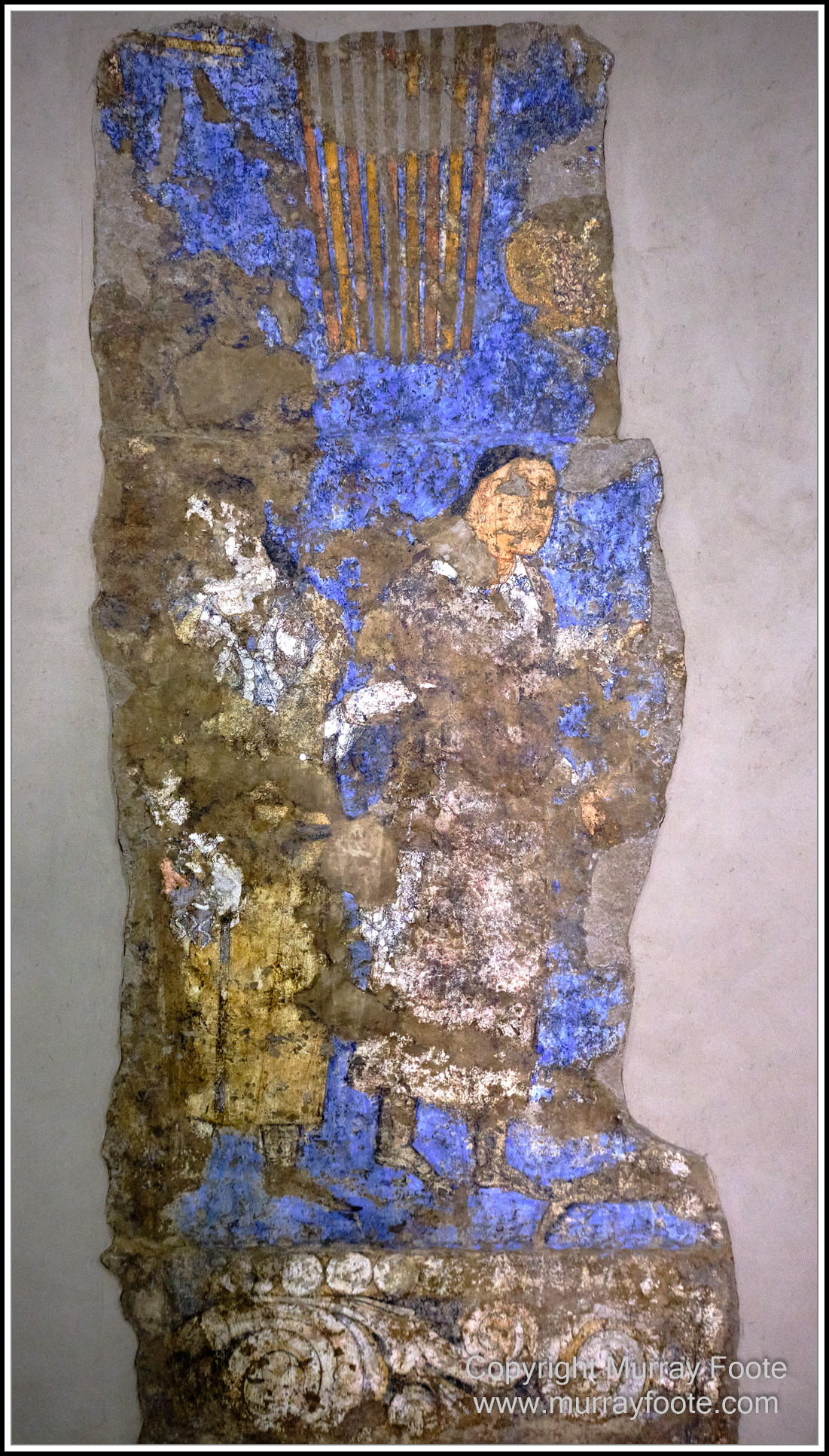 We next visited the Afrosiab Museum, a short distance from the Mausoleum of Daniel.  Russian archaeologists discovered Afrasiab in the 1880s and the museum includes some of their finds.  It also includes some seventh century murals from the royal palace, discovered in 1965 when building a road. They are from the time of King Varkhuman, and painted between 648 and 651, or shortly after 658.  He ruled a multicultural entity and was nominally a vassal to China but his polity did not last long as his palace was destroyed by the Arab general Sa’id Ibn Ithman between 675 and 677 CE and after that there were no kings of Samarkand.