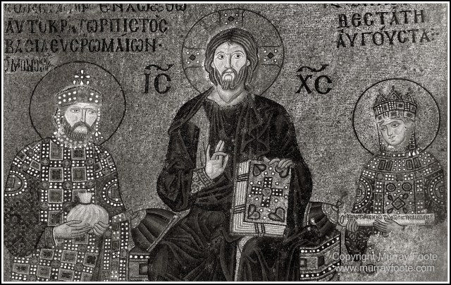 The Empress Zoe mosaic, from the 11th century, shows Constantine IX Monomarchus (Emperor 1042 to 1055), Christ Pantocrator and Empress Zoe. .