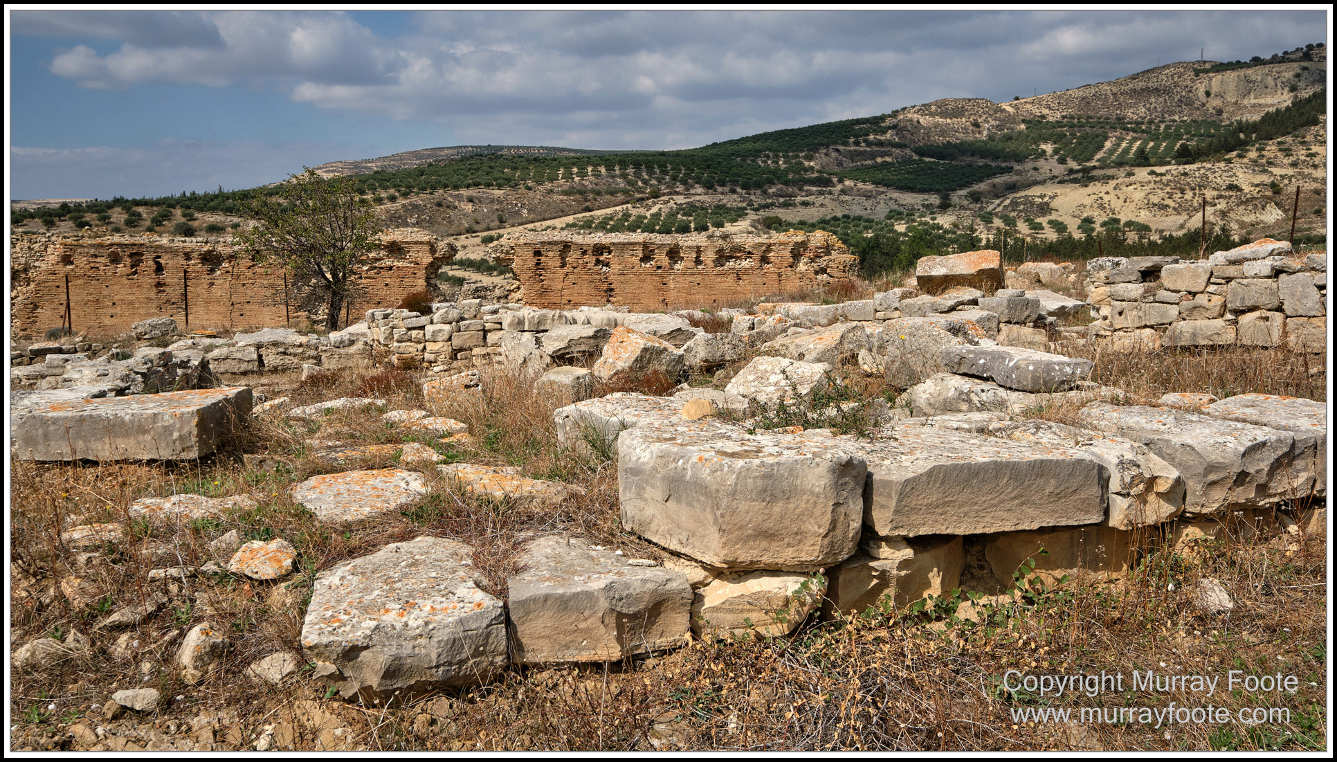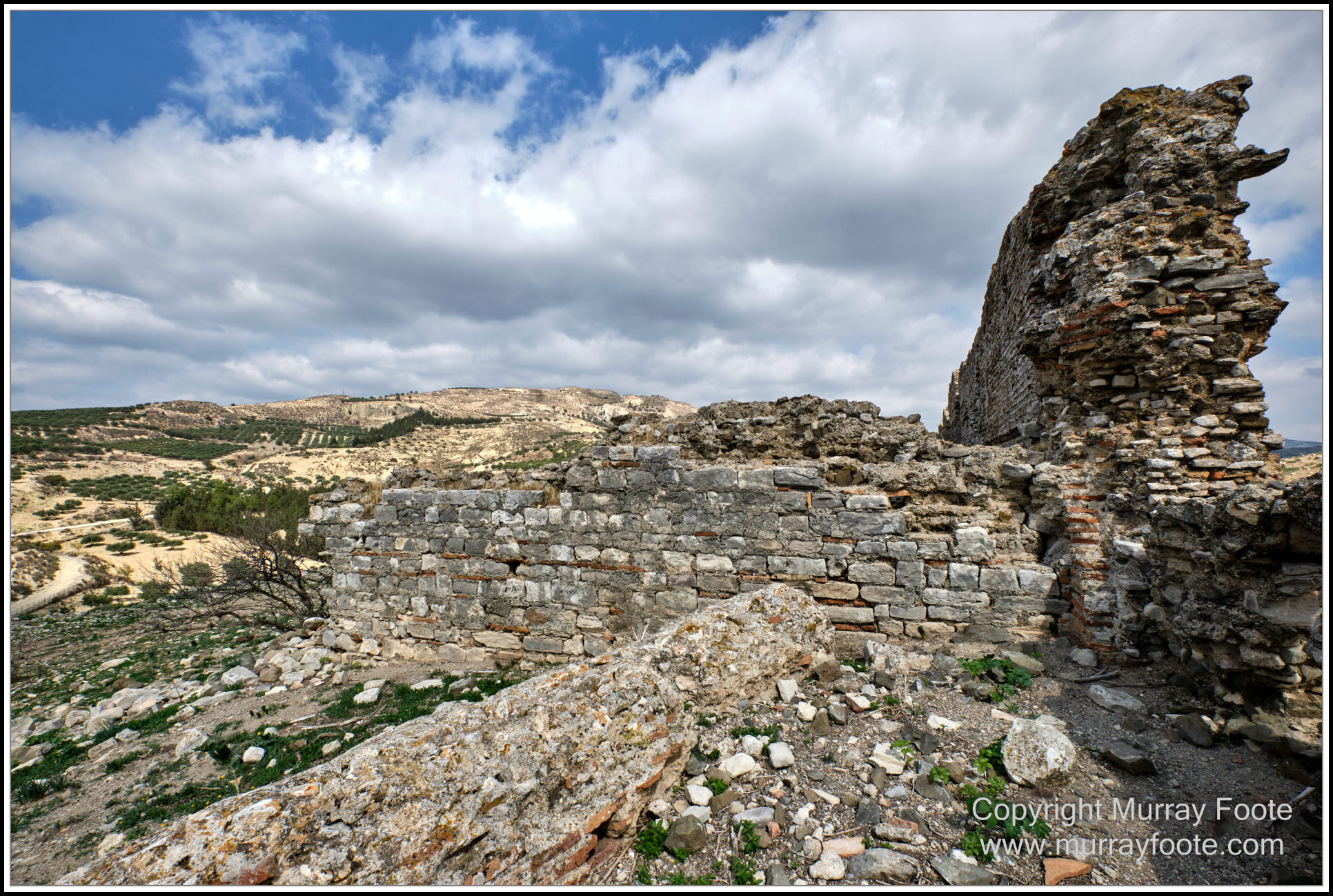 In the middle distance, behind the Citadel and near the cliff, is the Temple of Athena Pollouchos, from the 7th century BC. Significant sculptures were unearthed here. In the foreground may be either part of the temple or part of the basilica erected in the 6th to 7th century AD, using materials from the temple.