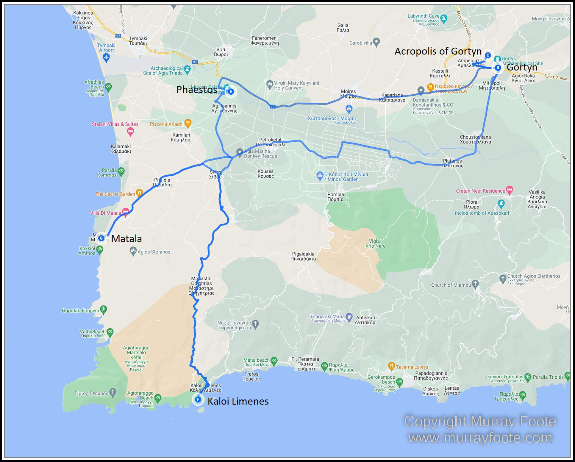 This was our route of travel for the day. From Matala we drove to the Acropolis of Gortyn and Gortyn (previous post), then to Phaestos and briefly to Kaloi Limenes and back to Matala (this post).