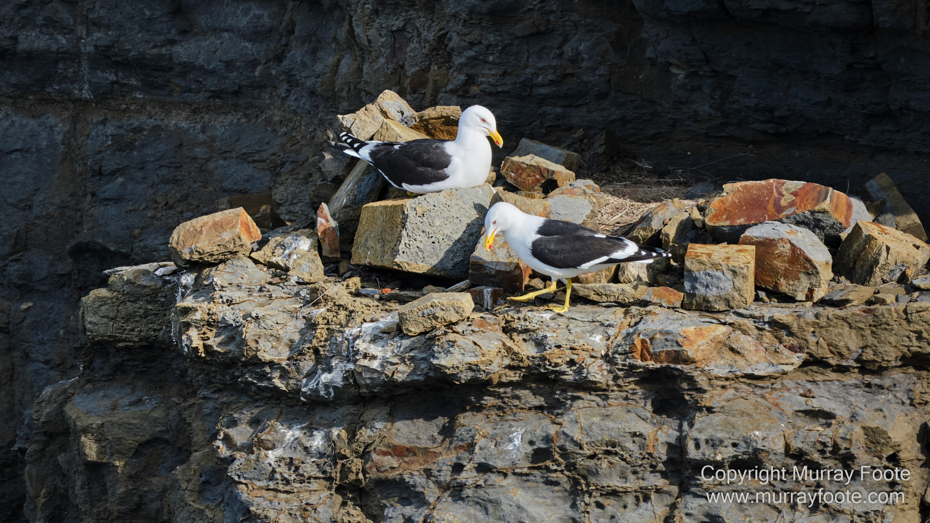 Now on Tasman Peninsula, just beyond Tasman Arch, a pair of kelp gulls in a cliff-side nest site.