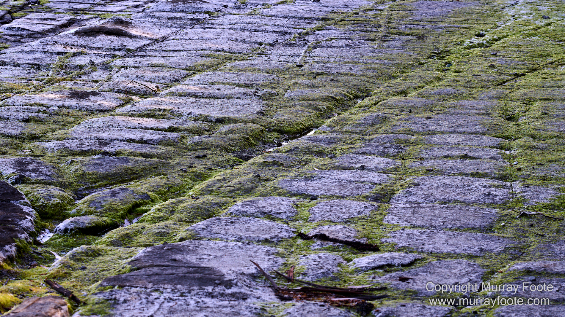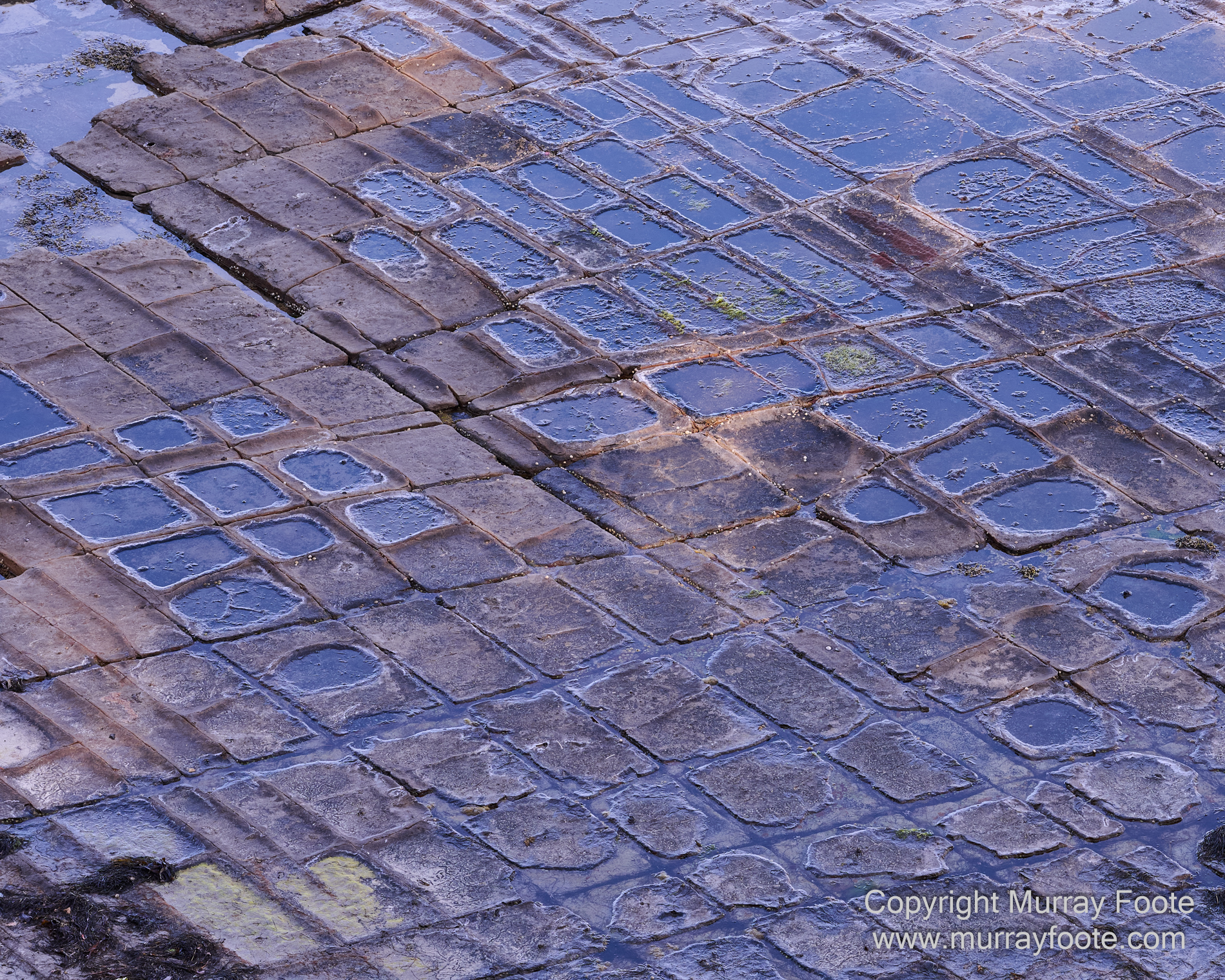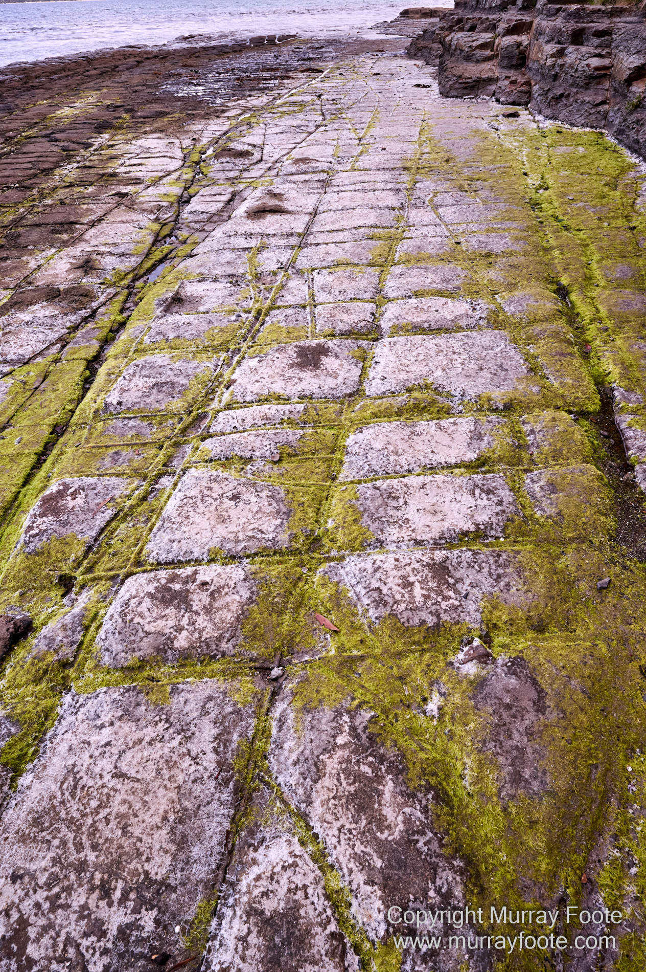 I was most impressed by the Tessellated Pavement at Pirates Bay, just before Eaglehawk Neck leading to the Tasman Peninsula. Here flat sandstone has been fractured into mainly rectangular segments. There can be pan formations and loaf formations. The pan formations have raised edges due to salt crystals. The loaf formations are closer to the seashore where the rocks do not dry out so much, so the salt does not form and the edges f the rectangles are recessed.