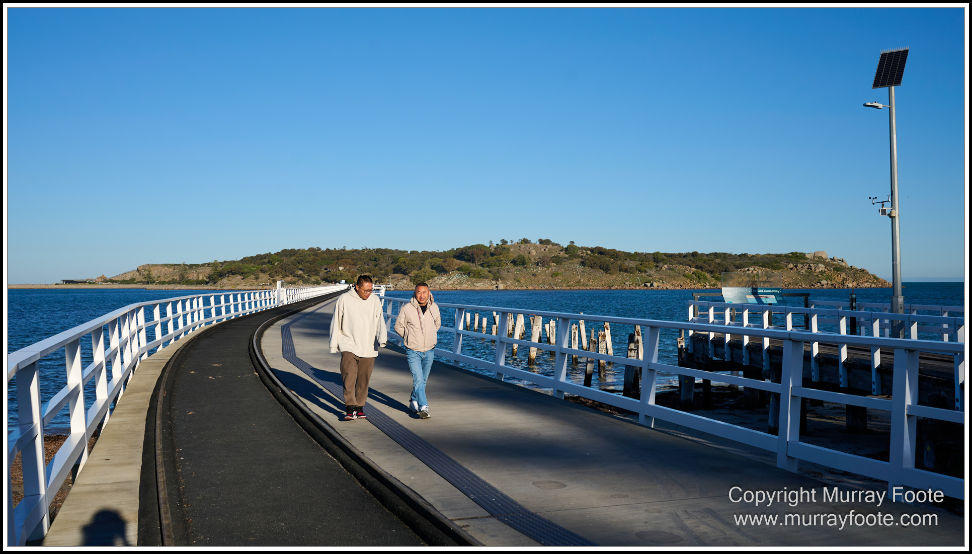 We are in Victor Harbour, looking along Granite Island Road and the Victor Harbour Horse-Drawn Tramway towards Granite Island. We are too late in the afternoon to see the horses and the tram though.