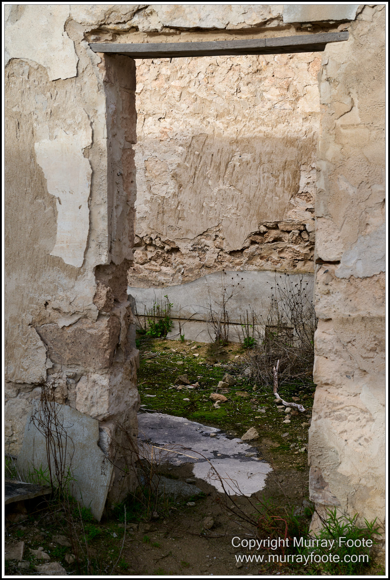 Looking through a door to a bricked-up fireplace in a derelict house.