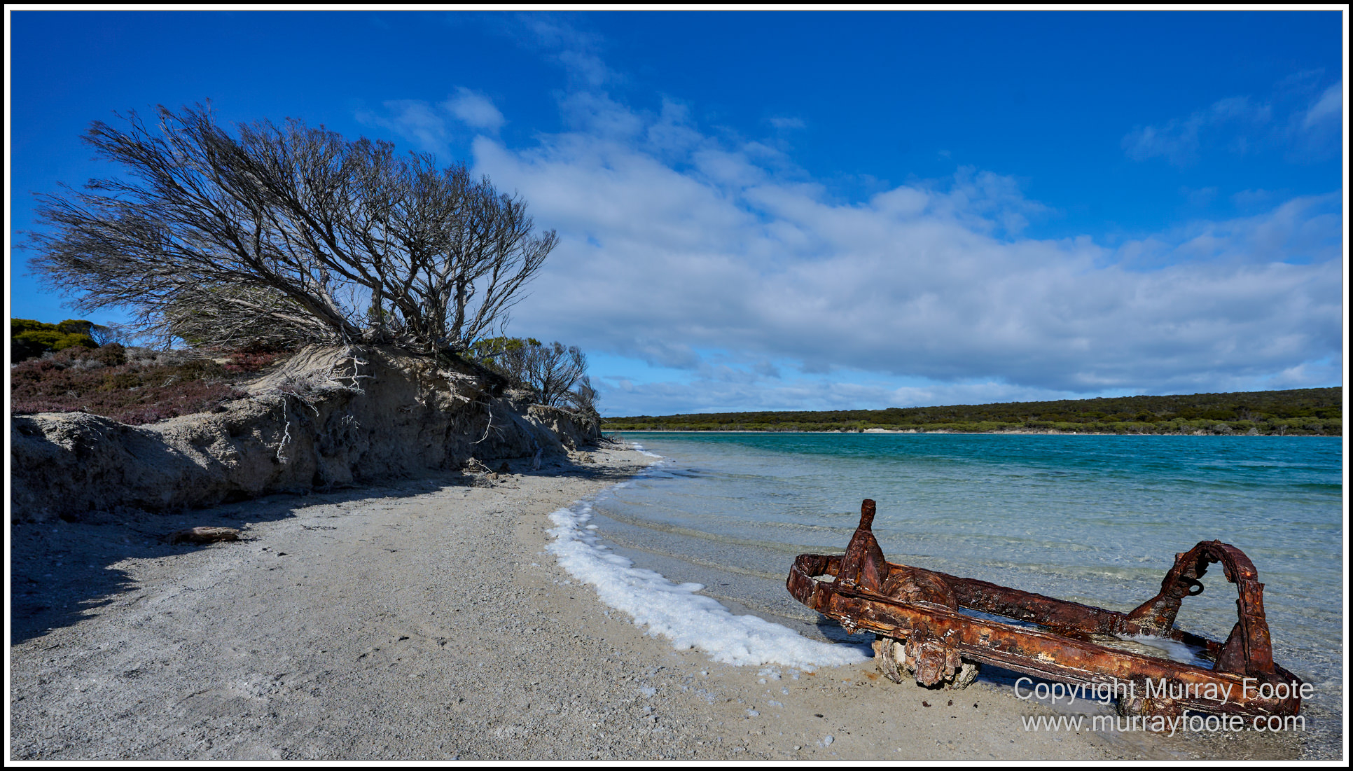 The lake was the source of the gypsum and the Crushing and Washing Plant was near here. The rusted object appears to be a cart left over from the mining and crushing.