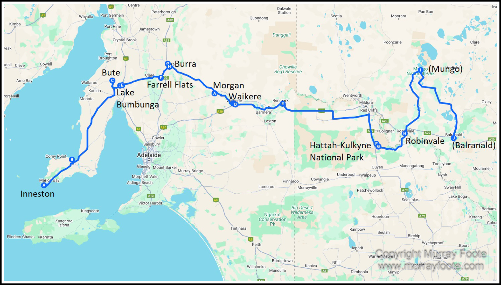 This is a trip over two days, heading back from Inneston at the end of Yorke Peninsula to Robinvale in New South Wales. Also shown on the map is Lake Mungo and part of the journey out through Balranald, which is covered in following posts .