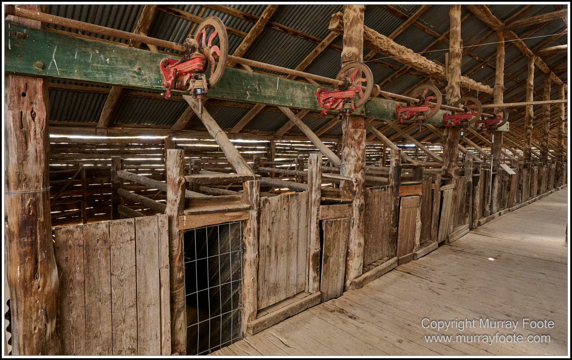 You can see here the overhead gear linking to the mechanised shearing.  The shears connected to this, the sheep were shorn underneath, and then sent through the gate and down a ramp.