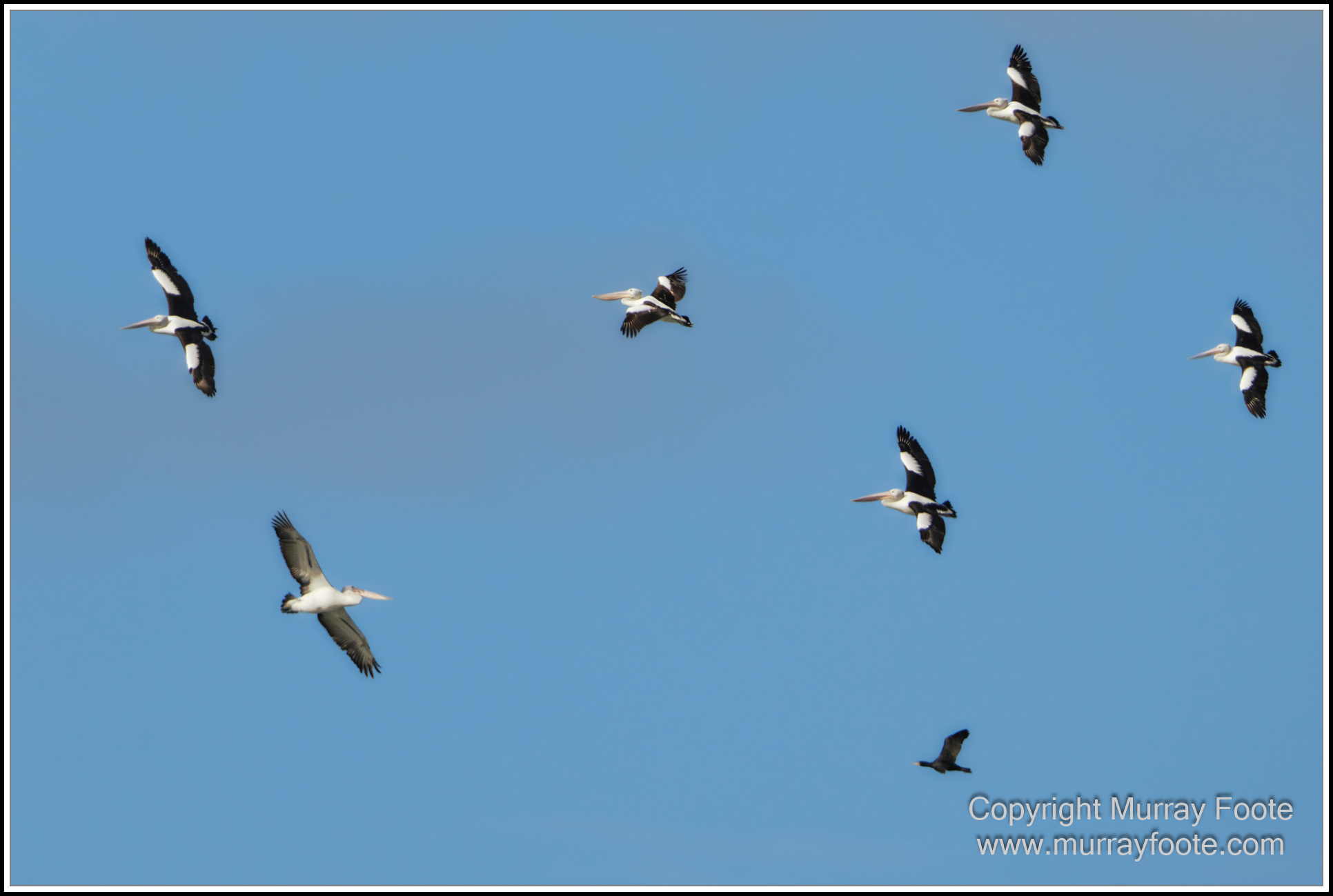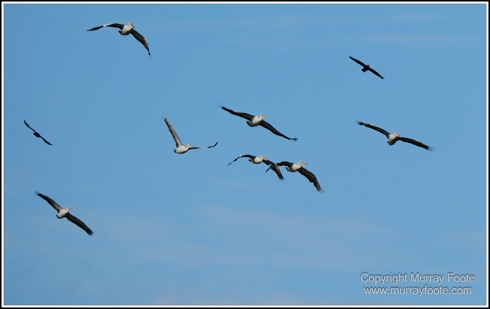 There are also two dark birds, not sure what they are. They appear to be behind the pelicans, large birds with long wings. The ends of the wings suggest a raptor but they seem to me to be not the right shape to be a wedgetail eagle.