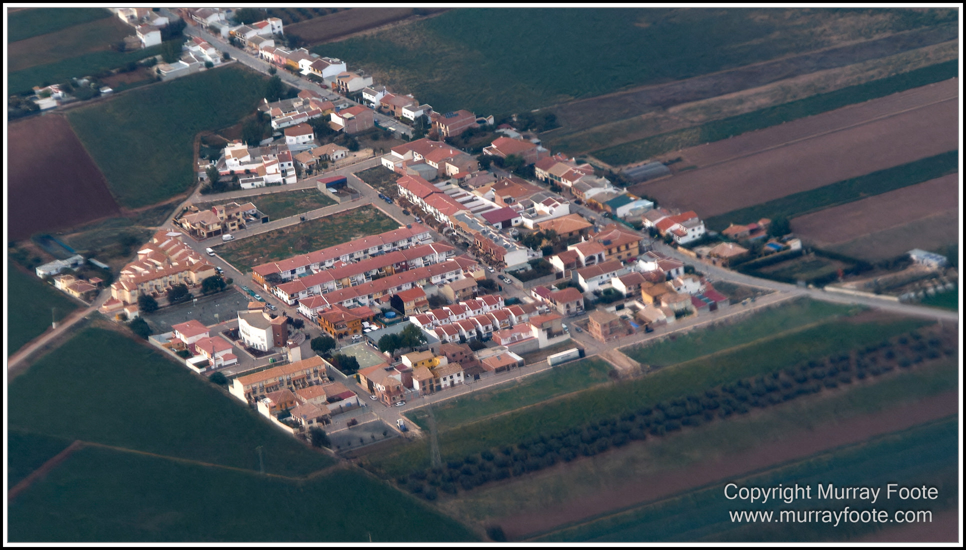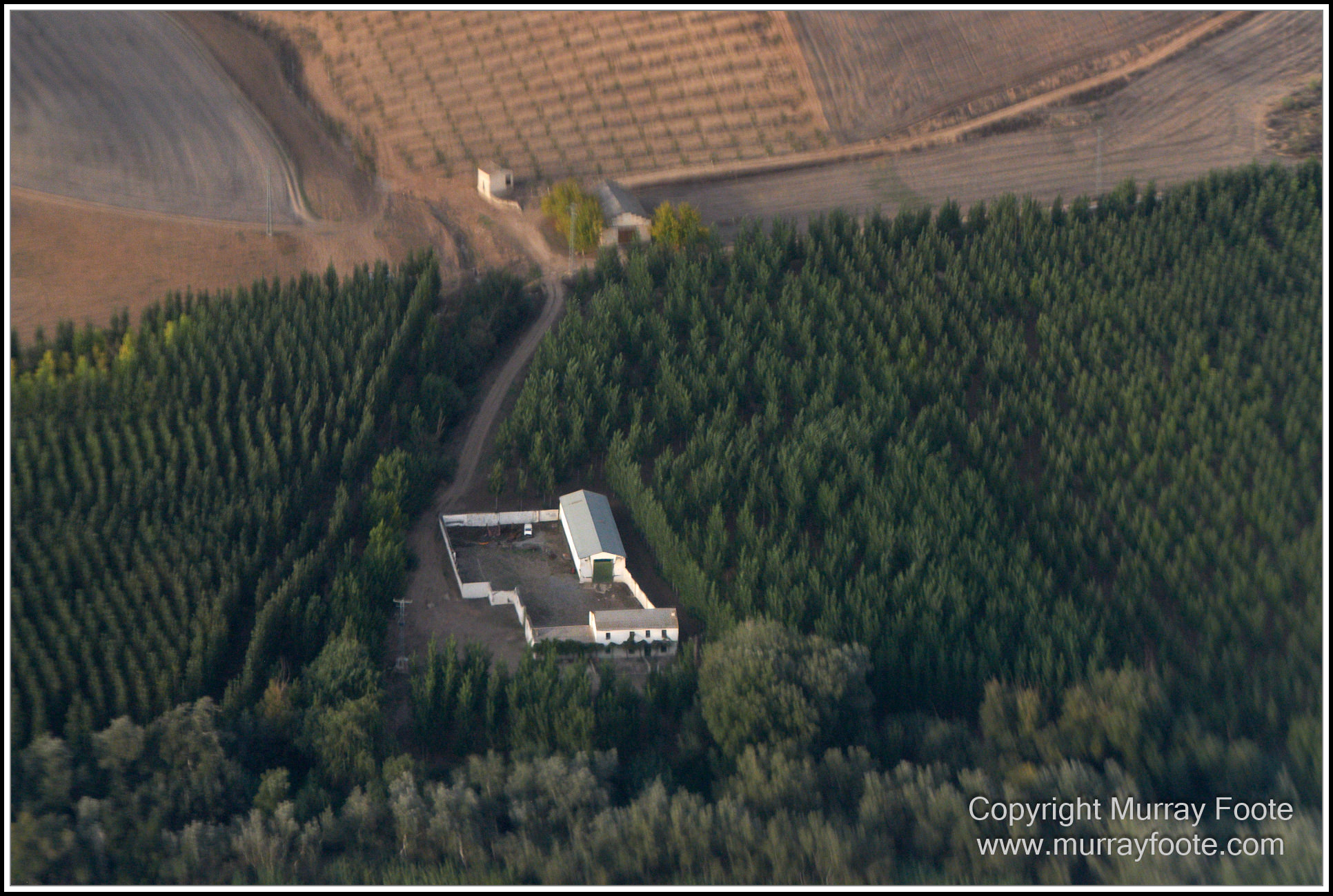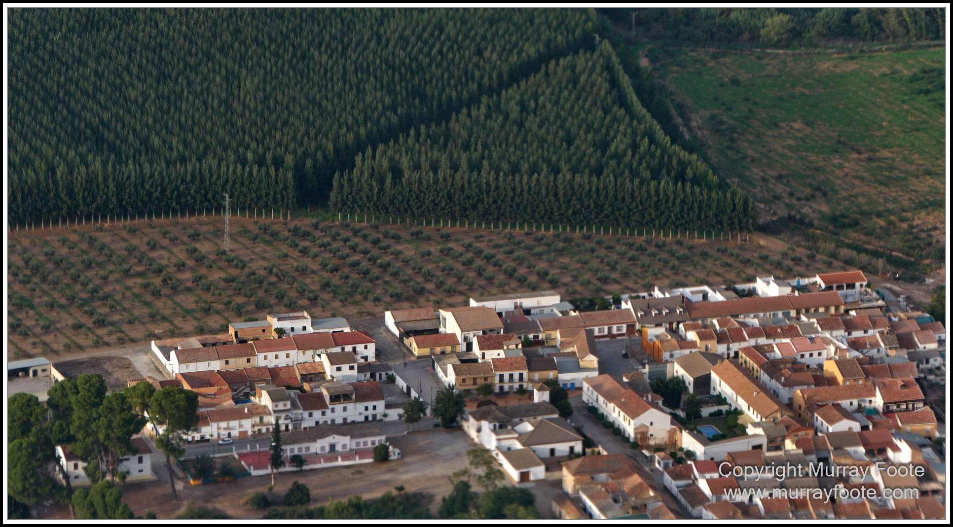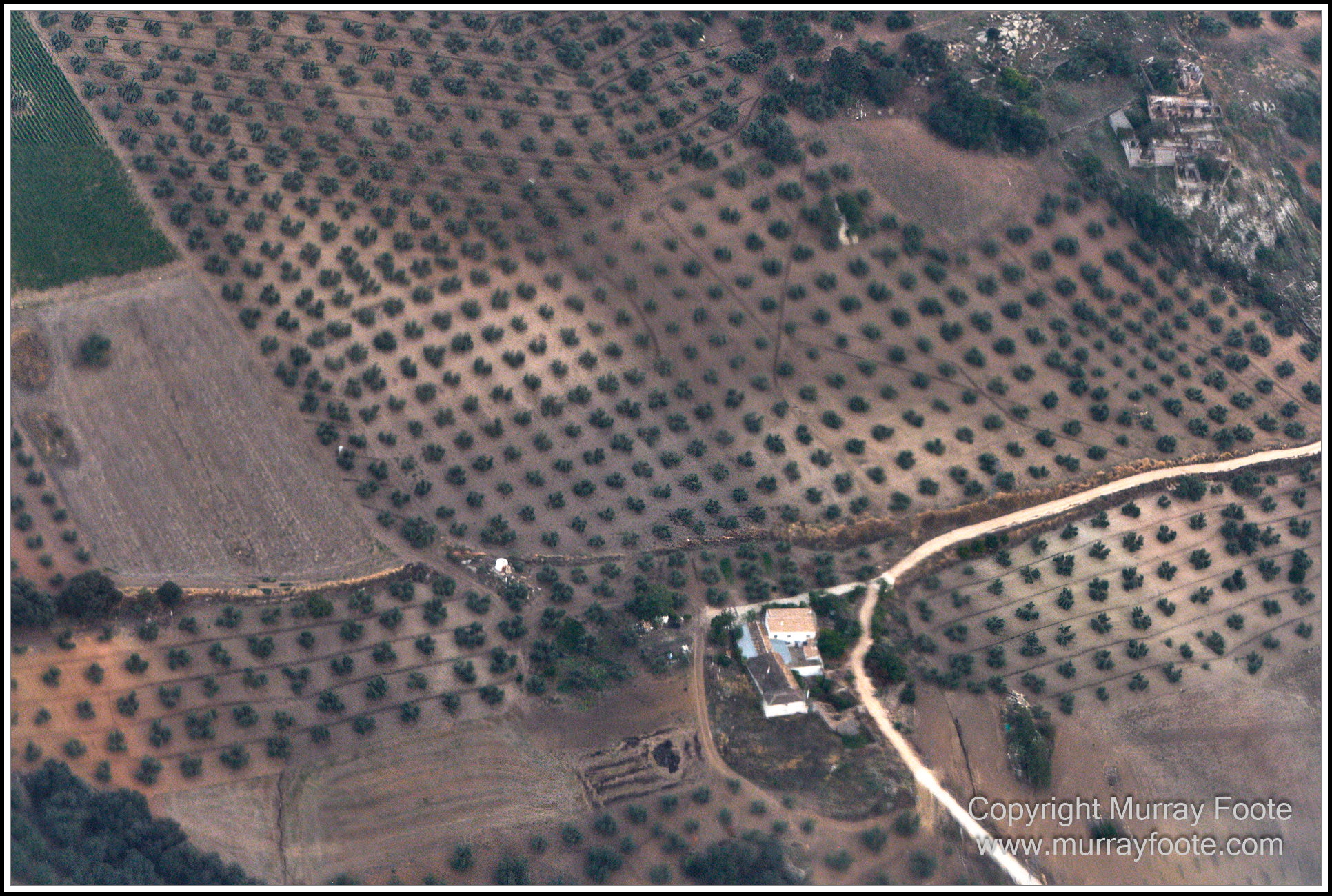 Looking down on a farm, perhaps an olive grove, and ruined buildings at top left.