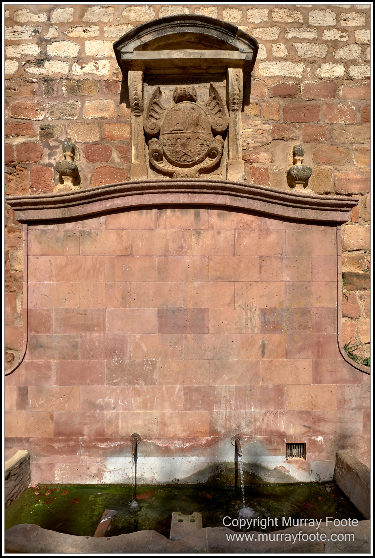 This is on an old tower of the Almohad town wall, probably originally wooden, and covered in stone during the 15th century. The coat of arms of the town is at the top. The water comes from an underground spring and persists even in the worst droughts.