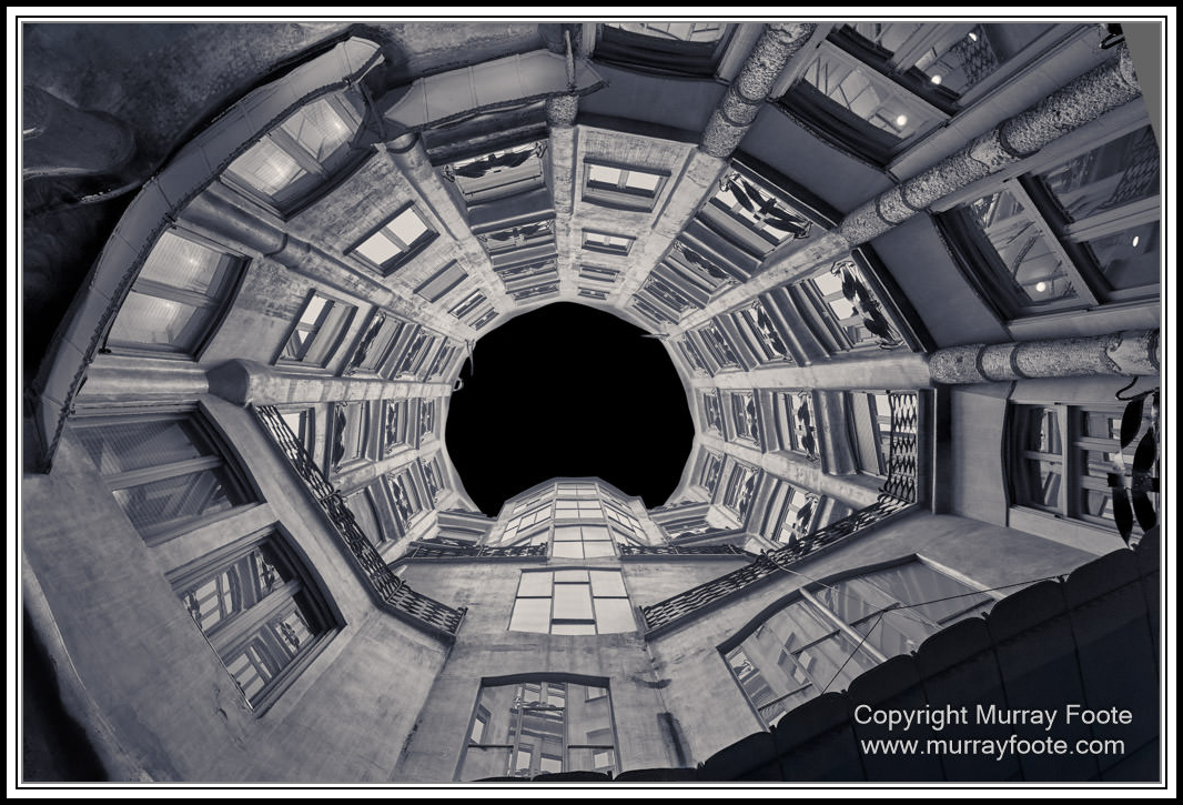 Looking up in the elliptical atrium, providing light and ventilation to the apartments.