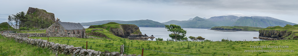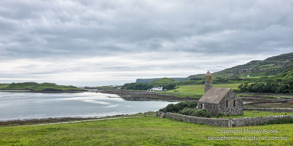 Another view of Canna with Sanday over in the distance, to the left. This small church, known as the Rocket Church, was built by Allan Thom in memorial to his father Robert Thom between 1912 and 1914. Since it is a Protestant church and the islanders are Catholic, it is little used.