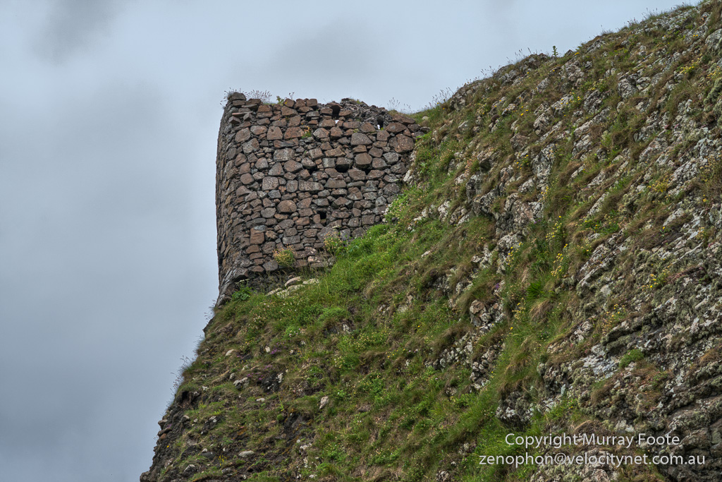 It is called a castle but it is really a small stronghold, utilising the rock face for some of the internal walls. The walls look dangerously undermined by erosion. It was described by Pennant in 1772 as “… a lofty slender rock, that juts into the sea: on one side is a little tower, at a vast height above us, accessible by a narrow and horrible path: it seems so small as scarce to be able to contain half a dozen people”.