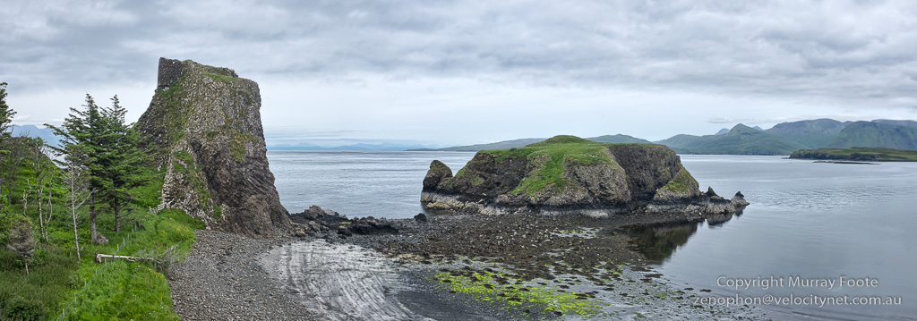 Coroghan Castle is on the stack (Coroghon Mor) at the left, which rises 70 to 80 feet above the sea shore. From this angle it is at the top left corner..