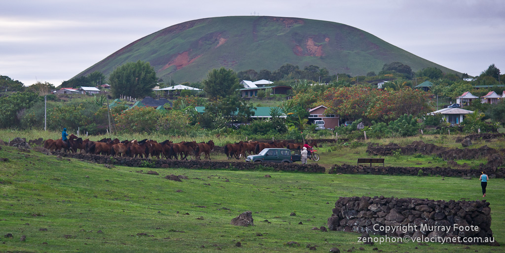 Just after dawn, a couple of riders ushered about 50 horses past on the road. Ahu Hanga Kio’e is on the northern edge of Hanga Roa. I am taking this photograph from beside the ahu so you can see how close some of the houses are. The volcanic cone in the background is Maunga Tangaroa. Maunga Puna Pau, where the Rapanui excavated the pukao or topknots is probably visible but off frame to the right.