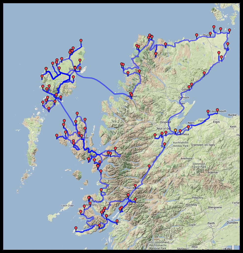 First I am flying from Canberra to Inverness, driving round the North-West Highlands and visiting Lewis, Harris, Skye and Mull. Then there is an 8-day photographic boat trip to the Hebrides including St Kilda (not shown on the map). Finally I return along Loch Ness to Inverness.